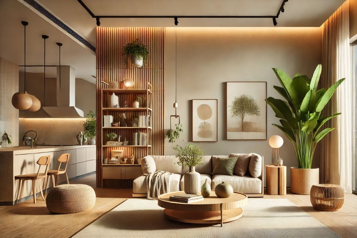 Large indoor plants, like fiddle-leaf figs and monstera, are becoming a staple in modern interiors. Beyond aesthetics, plants help improve air quality, making them both functional and stylish. Natural materials such as wood-panelled walls, stone countertops, and wicker furniture add warmth and texture while maximizing natural light through large windows enhances the connection to the outdoors.
