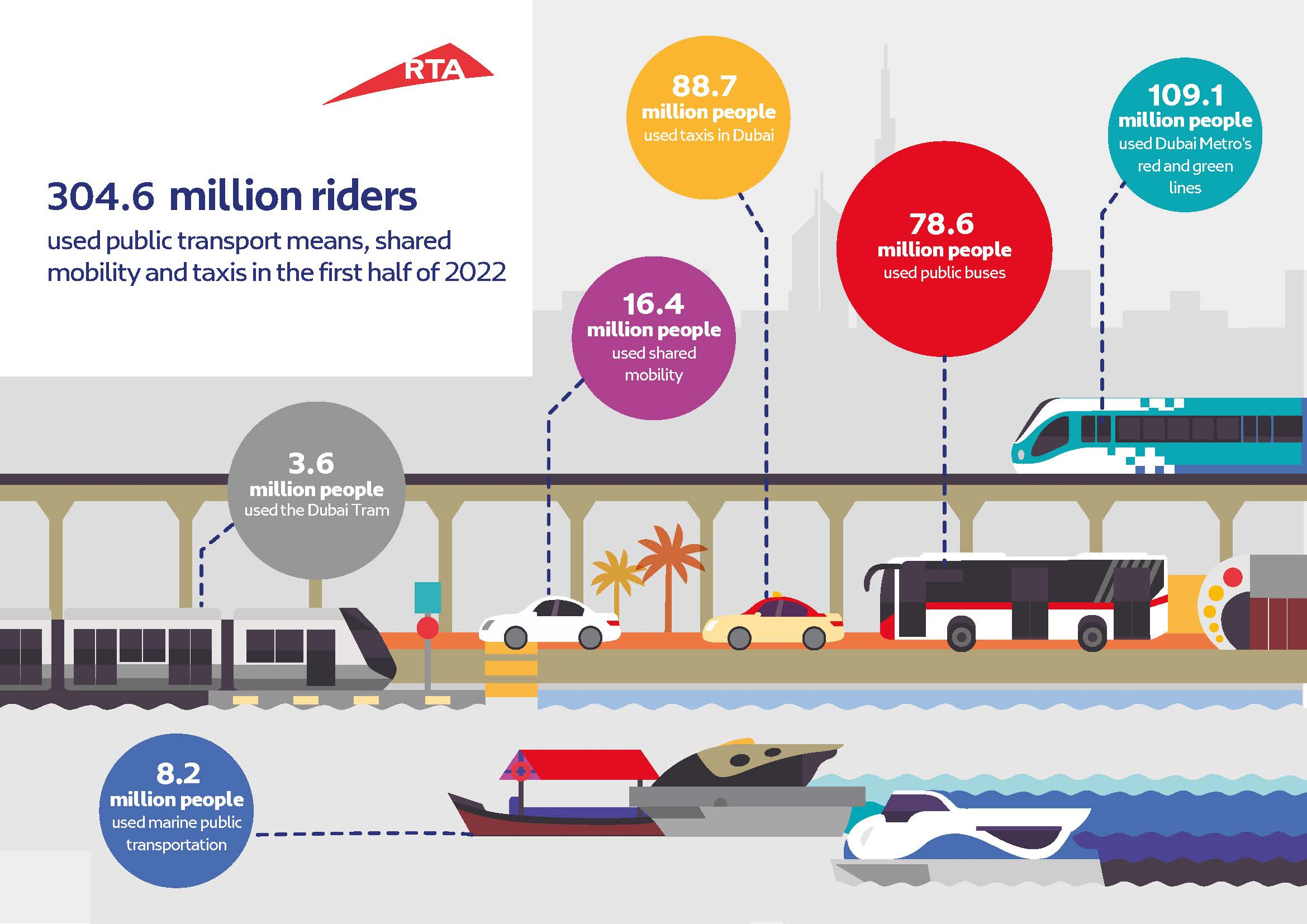 In the first half of 2022, Dubai Tram lifted 3.6 million riders, public buses served 78.6 million riders, and marine transport means (abras, water bus, water taxi, and ferry) lifted 8.2 million riders. Shared mobility means (e-hailing, smart rental vehicles, Bus-On-Demand) lifted 16.4 million riders and taxis (Dubai Taxi, and franchise companies) lifted 88.7 million riders.