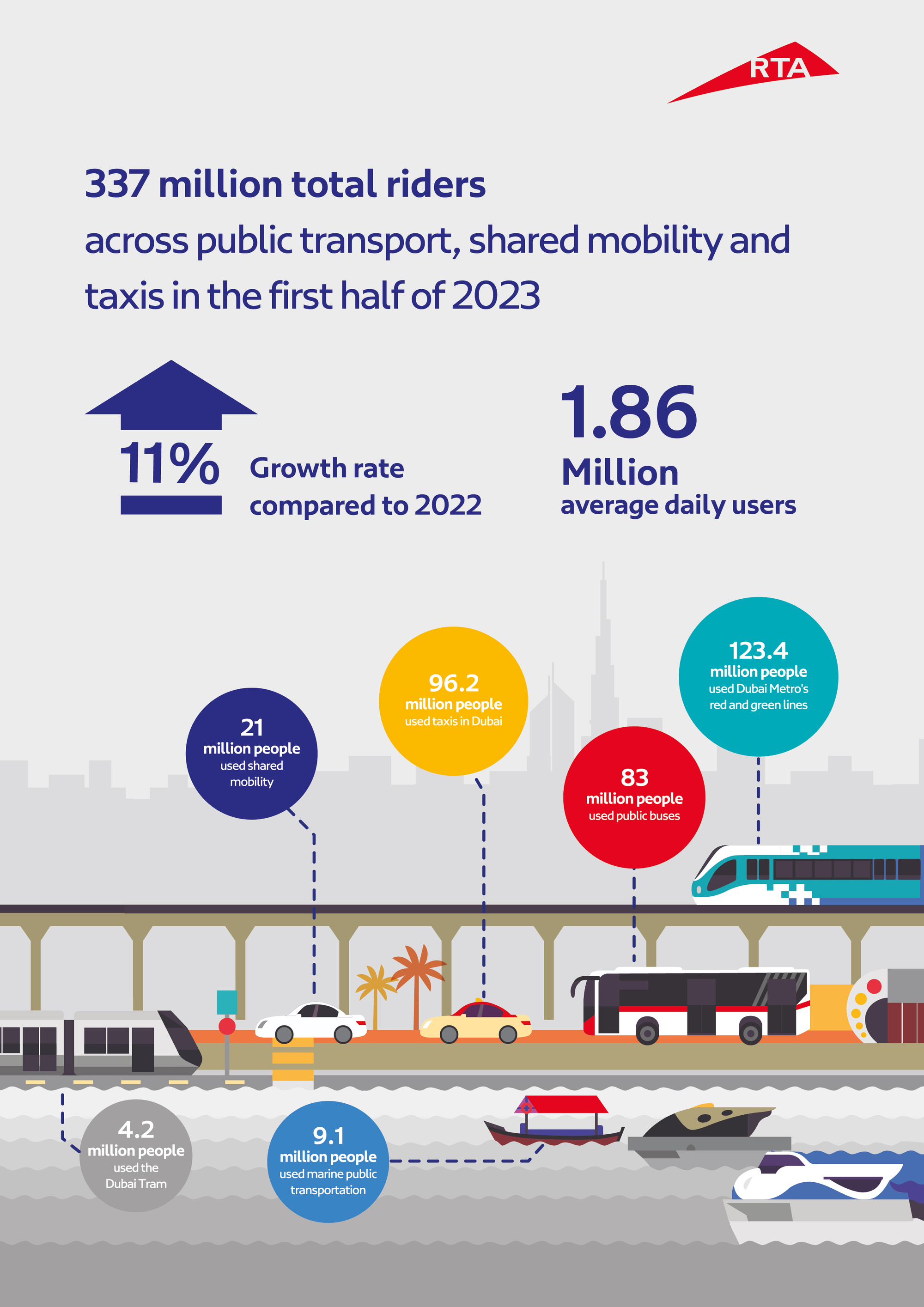 In the first half of 2023, Dubai Tram lifted 4.2 million riders, public buses served 83 million riders, and marine transport means (abras, water bus, water taxi, and ferry) lifted 9.1 million riders. Shared mobility means (e-hail, smart rental vehicles, Bus-On-Demand) lifted 21 million riders, and taxis (Dubai Taxi, and franchise companies) lifted 96.2 million riders.