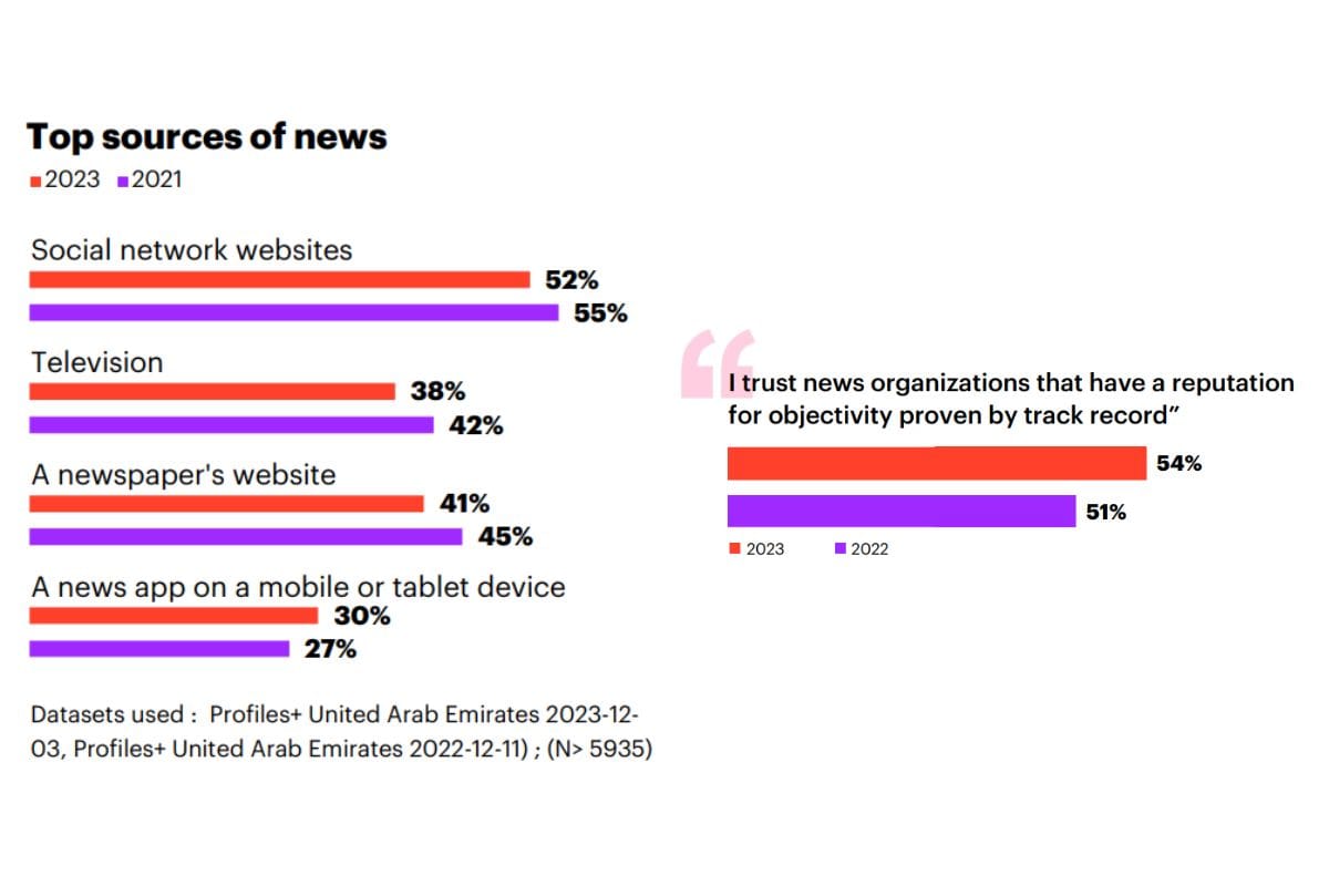 Over half of UAE residents (52%) still rely on social media as their primary news source, although there has been a slight decrease in its usage over the past two years. Meanwhile, there has been a slight increase in the usage of newspaper apps. Social media and newspaper websites are the top two news sources for all age groups, with newspaper apps also ranking among the top five sources.