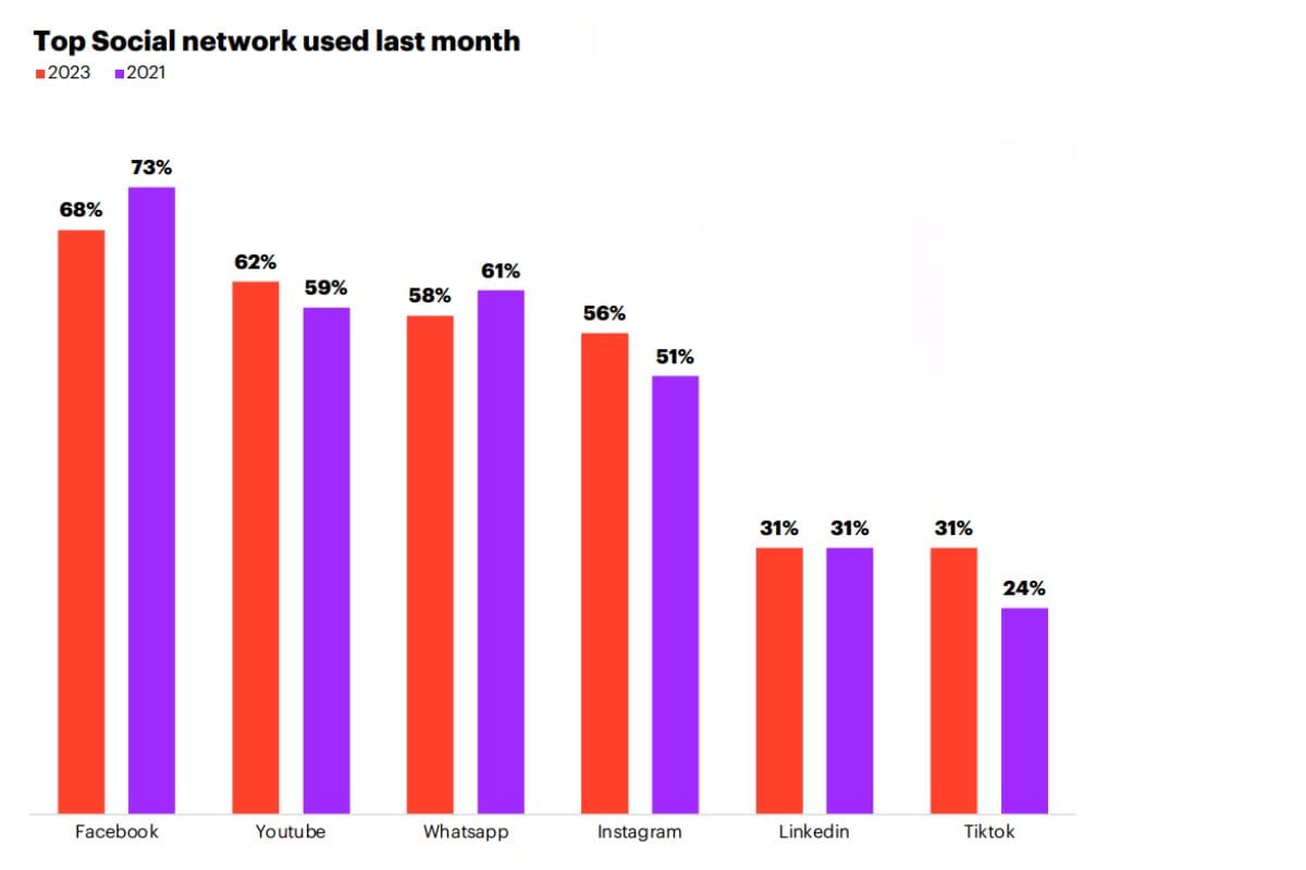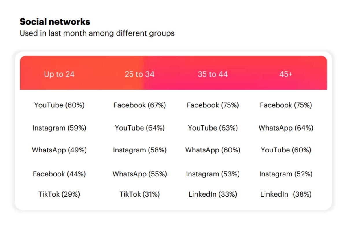 65% of the general population primarily uses social media for entertainment and news content. While Facebook remains the most used social network, TikTok and Instagram have seen the most significant growth in the past two years. Facebook is popular for users aged over 25. YouTube is more popular for those aged under 25.