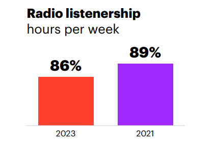 Although radio listenership has slightly decreased in the last two years, nearly nine out of ten people listened to the radio in the last week.
