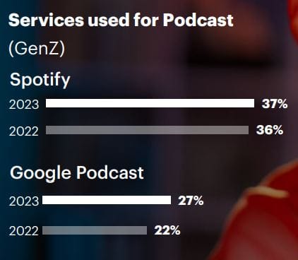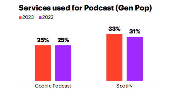 The most commonly used apps/services for listening to podcasts are Spotify and Google Podcasts. Among Gen Z, 35% listen to podcasts for 6 or more hours per week, compared to 27% of the national representative sample.