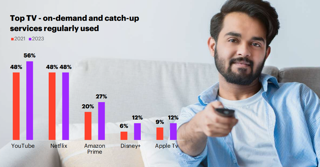 44% of Gen Z individuals believe that live TV is outdated, compared to 38% of the general population. YouTube remains the preferred choice for on-demand TV among Gen Z and has experienced the most growth in the last two years, followed by Amazon Prime and Disney+.