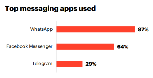 Over half (54%) of the general population uses messaging apps or services, with WhatsApp being the most popular choice.