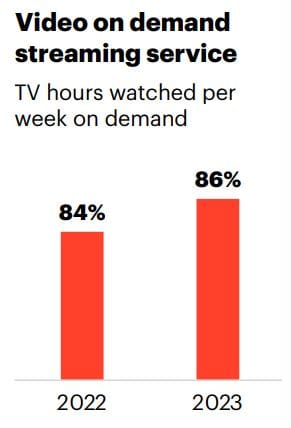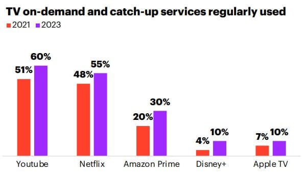 In 2023, 85% of individuals watched TV via a video-on-demand streaming service, slightly higher than the previous year. All platforms have seen increased usage over the last two years, with Amazon Prime and YouTube experiencing the largest growth. YouTube and Netflix continue to be the most popular platforms.