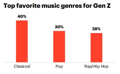 36% of individuals stream music for 6 or more hours weekly, with those under 25 years old streaming music for longer durations. Specifically, 12% of them stream music for 21 hours or more, compared to 6% of those aged 35 and older. YouTube Music and Spotify are the most popular streaming services, experiencing the highest growth in the last two years. As for favorite music genres, classical (46%), pop (35%), and country (28%) music top the list.