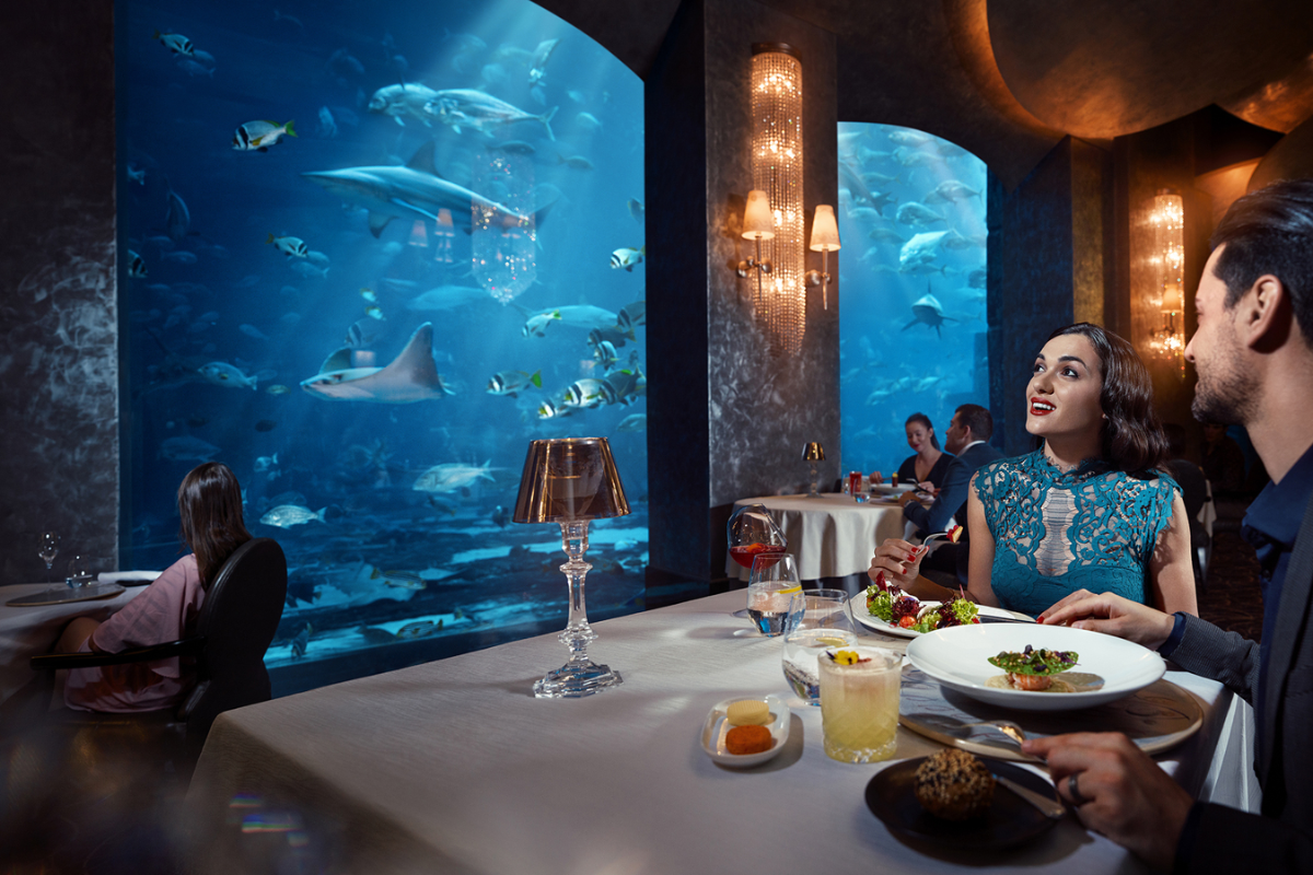 Enjoy a fine dinner with a view of the aquarium! Ossiano is an extraordinary fine dining experience that gives you delicious food while stingrays, sharks, and fish glide past your table! Michelin Star chef Greogrei Berger takes pride in offering guests an opportunity to taste an exceptional menu that showcases some of the best produce from around the world. Taste beautiful and mouth-watering dishes in an incredibly unique setting within a giant aquarium that is home to more than 65,000 marine animals, there’s nowhere else you can have a dinner like this. The seafood dishes are delicious, and the desserts will leave your sweet tooth feeling satisfied. It is ideal for a romantic dinner that combines fine European cuisine with a sea adventure.