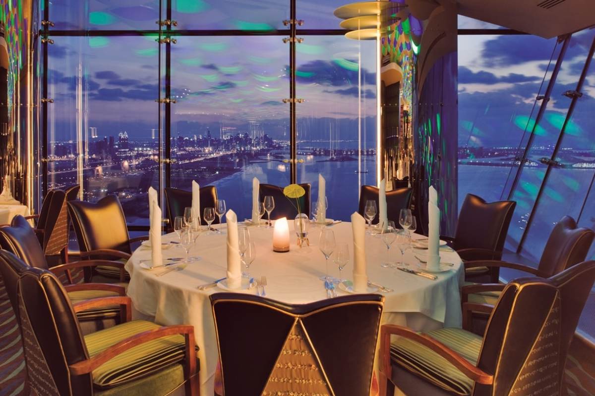 Al Muntaha is perched atop The Burj Al Arab, one of Dubai's most recognizable buildings. You can expect stunning views and a complex, creative menu featuring primarily French food with Mediterranean influences at this authentic Italian restaurant. The restaurant's top-notch cuisine and breathtaking views live up to its name, which means "the ultimate." Each dish served by Chef Saverio Sbaragli is expertly plated to elevate your fine dining experience and make sure that every dish reflects his masterful touch. Both the king crab tartlet and the warm salad with truffle are excellent. Additionally, if you're craving seafood, try the blue lobster or sea bass with artichokes and flavorful herbs. Order off the menu or leave the planning to the pros by ordering the six-course tasting menu that highlights the best of Al Muntaha.