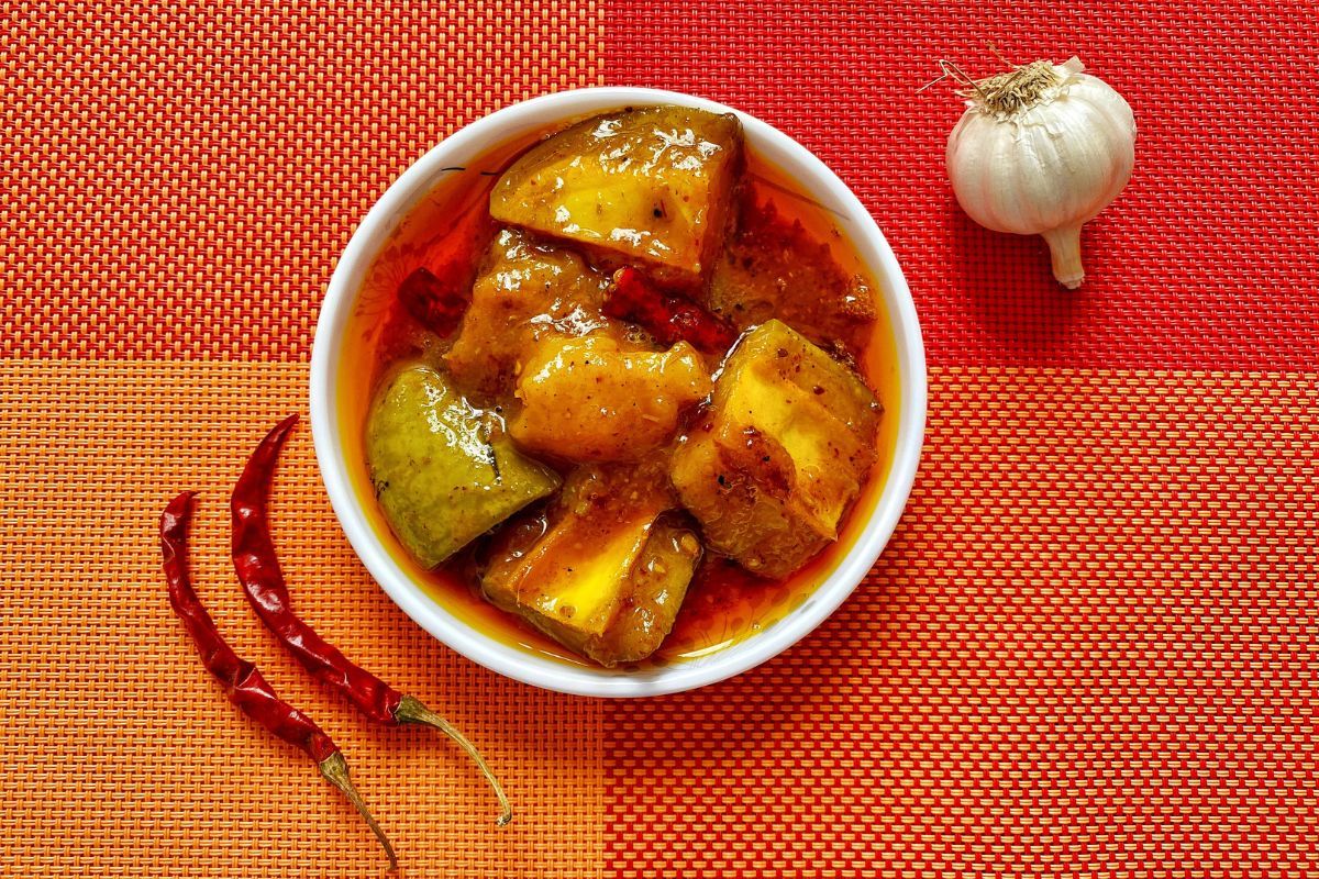 Found in many forms across India, Achaar is a traditional Indian pickle eaten as a side dish with meals. Cured in salt and vinegar and then preserved in oil, a range of vegetables are marinated with a handmade mixture of chilli paste and other spices. The resulting dip adds a tangy twist to your meal. Perfect for those who relish a kick of spice, it’s best enjoyed with Aloo Paratha (potato stuffed Indian flatbread).
