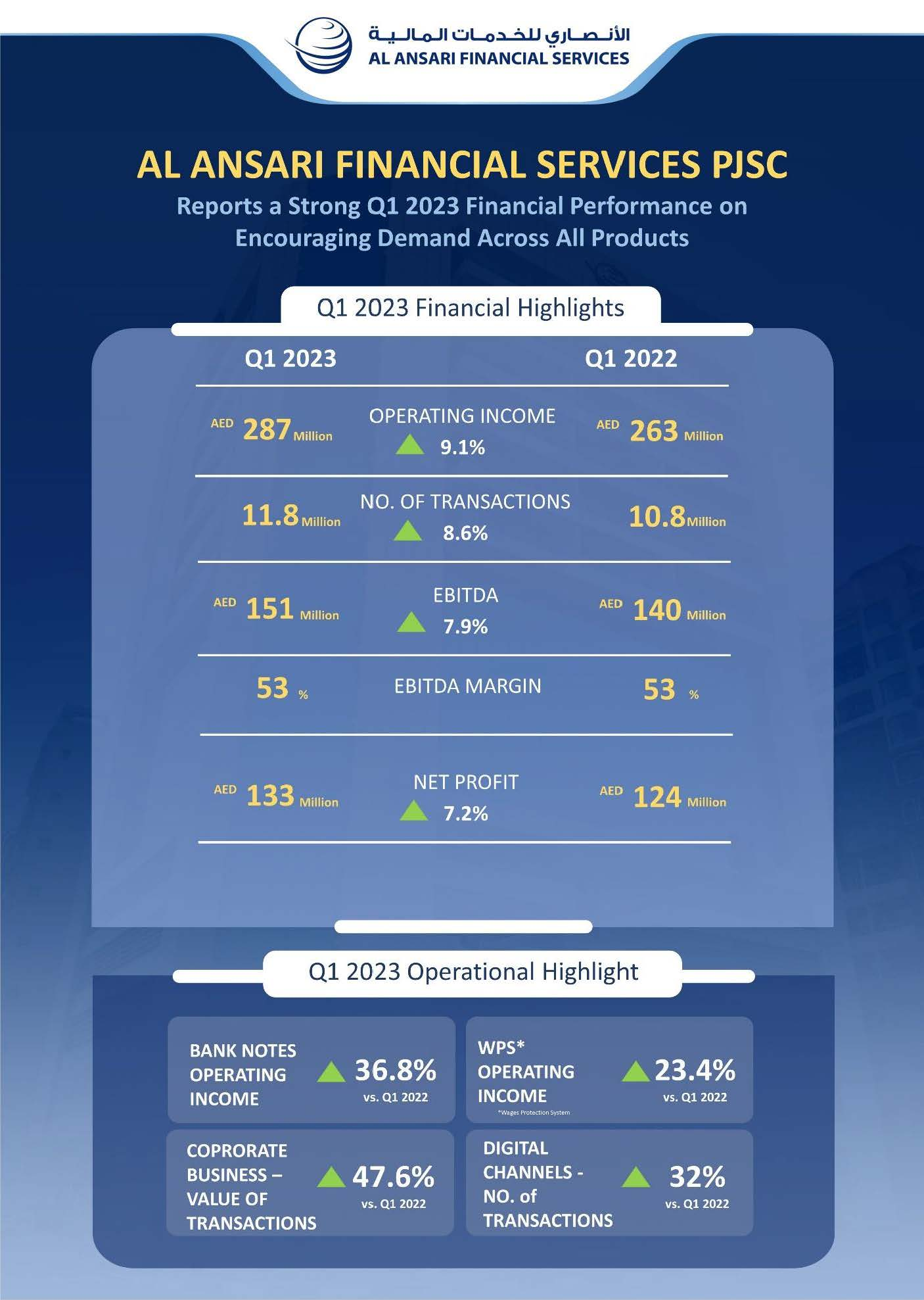 - Al Ansari Financial Services Reports a 7.2% Net Profit Increase in Q1 2023 to AED 133 million on Strong Demand Across All Products