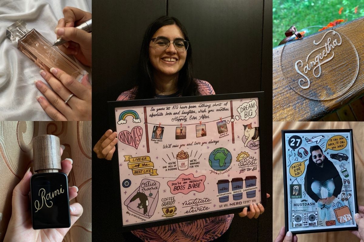 I’m Srishti, an engraver and lettering artist. I’m all about elevating gifts and products to make them more personal and unique. I engrave lots of things by hand - including wine glasses, perfume and alcohol bottles, and marble coasters. As for my lettering, some of the gifts I create include framed cards, wall posters and Christmas ornaments. I like having a mix of analogue and digital in my work.