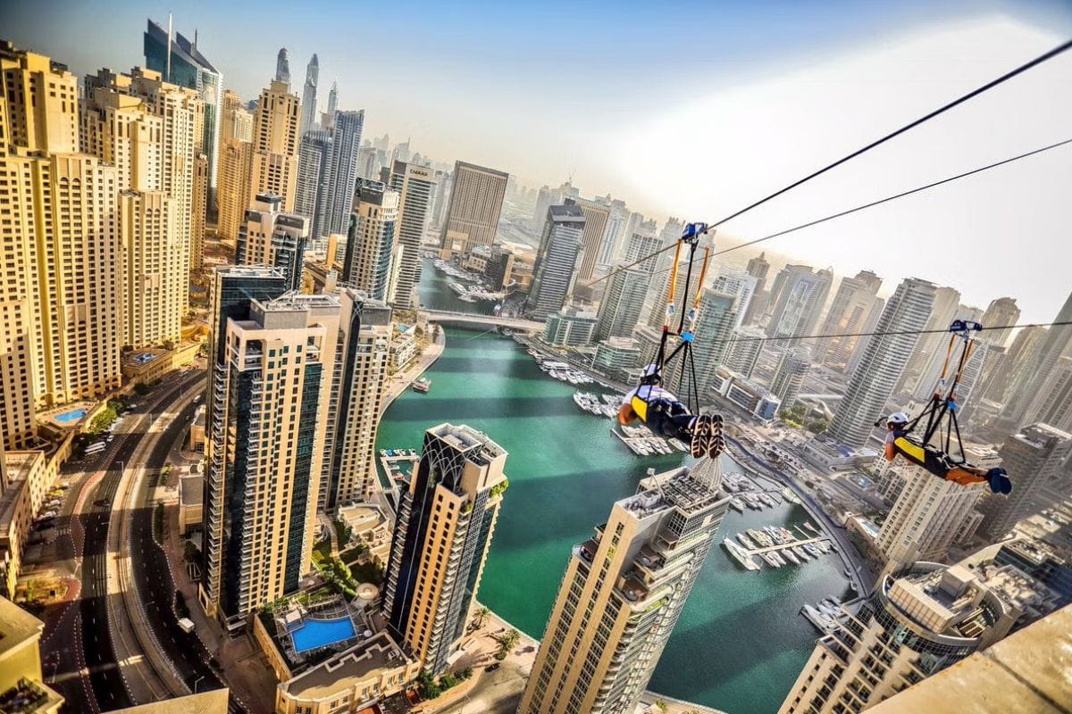 One of the most thrilling zipline experiences in the city is the XLine Dubai Marina. Stretching over 1 kilometer across the stunning Dubai Marina, this zipline lets you soar at speeds of up to 80 kilometers per hour, offering a bird's-eye view of the city’s sparkling skyscrapers, luxury yachts, and crystal-clear waters below. The exhilarating ride starts from the top of a tower and lets you glide across the marina to a platform on the opposite building, providing an unforgettable panoramic view of Dubai’s architectural wonders.