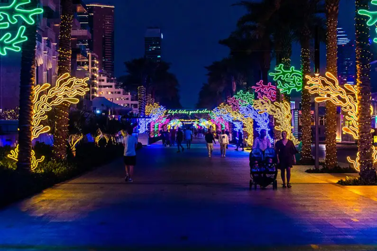 Prepare to be immersed in a theatrical underwater scene in each of the Palm Monorail's Nakheel Destinations—The Pointe, Nakheel Mall, and Palm West Beach. Visitors on the Palm Monorail will be able to travel through the underwater world and see illustrations, animations, life-sized dolphins, jellyfish, pink coral ornaments, starfish, seashells, and much more. The installation's sustainability is central, with every element made from recycled, repurposed, or reusable materials. Visitors to The Pointe can celebrate the holiday season by strolling around the illuminated promenades, which offer numerous photo opportunities. The Pointe Fountain shows will be festively themed, and they will be accompanied by giant underwater illuminated sculptures.