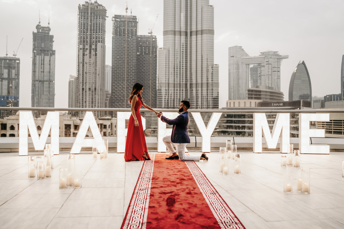 Cupid will be proud and teary-eyed when you take your partner with you to soar above the serene desert scenery of Dubai in a hot air balloon. Opt for a private balloon ride, where you'll witness the sunrise, vast desert landscapes, and the majestic Hajar Mountains, all complemented by a gourmet breakfast. For an extra touch of romance, consider orchestrating a surprise marriage proposal amidst the breathtaking backdrop of the Dubai desert during the hot air balloon ride.