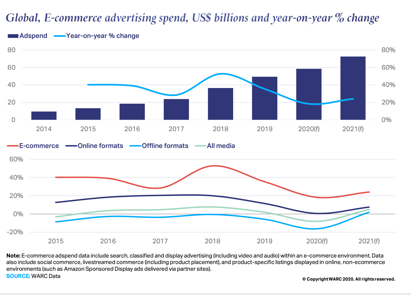 - Ad formats vary, though this money is typically spent on sponsored keyword search, targeted display ads on e-commerce sites, and social/ live-stream commerce.