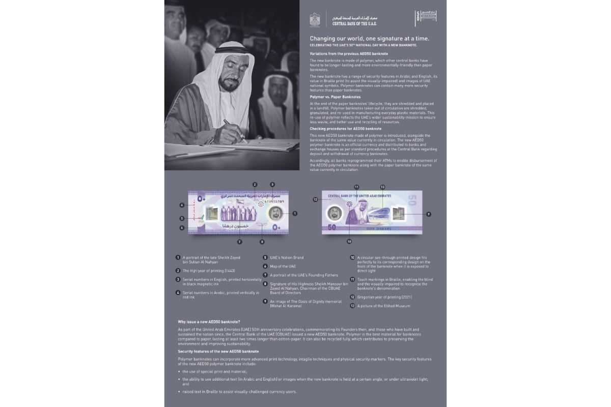 The Central Bank of the United Arab Emirates (CBUAE) has announced that the new AED50 polymer banknote is an official currency and to be used alongside the paper banknote of the same value, currently in circulation.