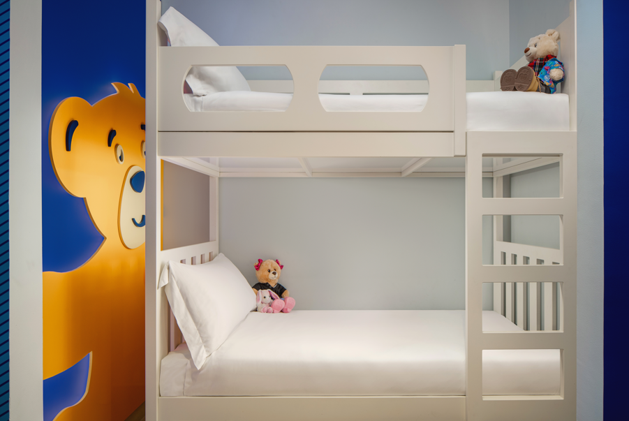 Experience the ultimate sleepover in the Mirage Build-A-Bear Suite Collection, featuring bright blue walls and playful teddy-themed décor. Each suite includes cosy bunk beds, a king-sized bed, and an exclusive teddy bear skin to take home. Enjoy breathtaking views of the Arabian Gulf, offering fun for kids and relaxation for parents.