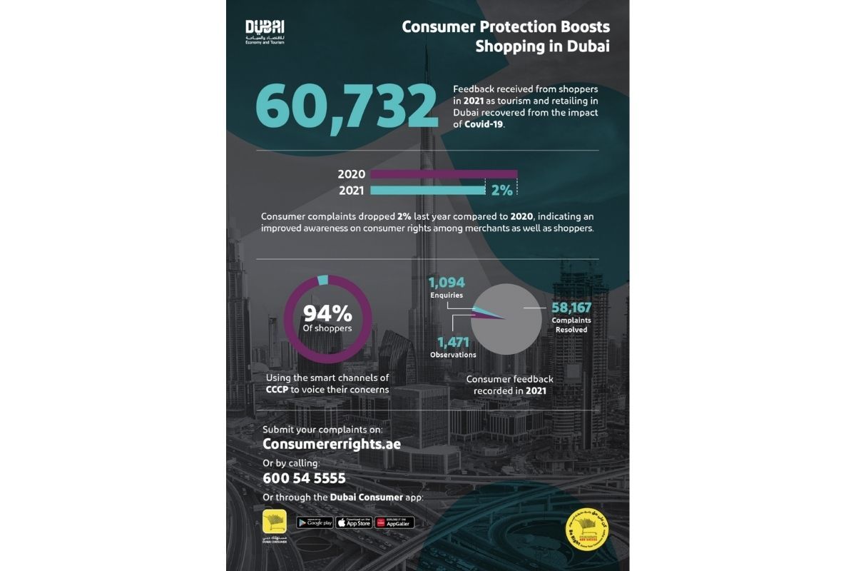 The Commercial Compliance and Consumer Protection (CCCP) sector in the Department of Economy and Tourism received over 60,000 feedback from shoppers in 2021 as retailing in Dubai recovered from the impact of Covid-19.