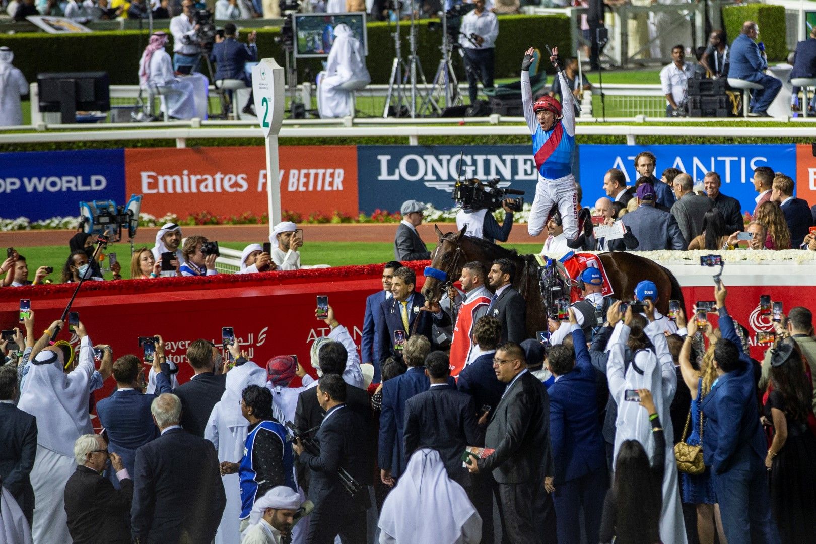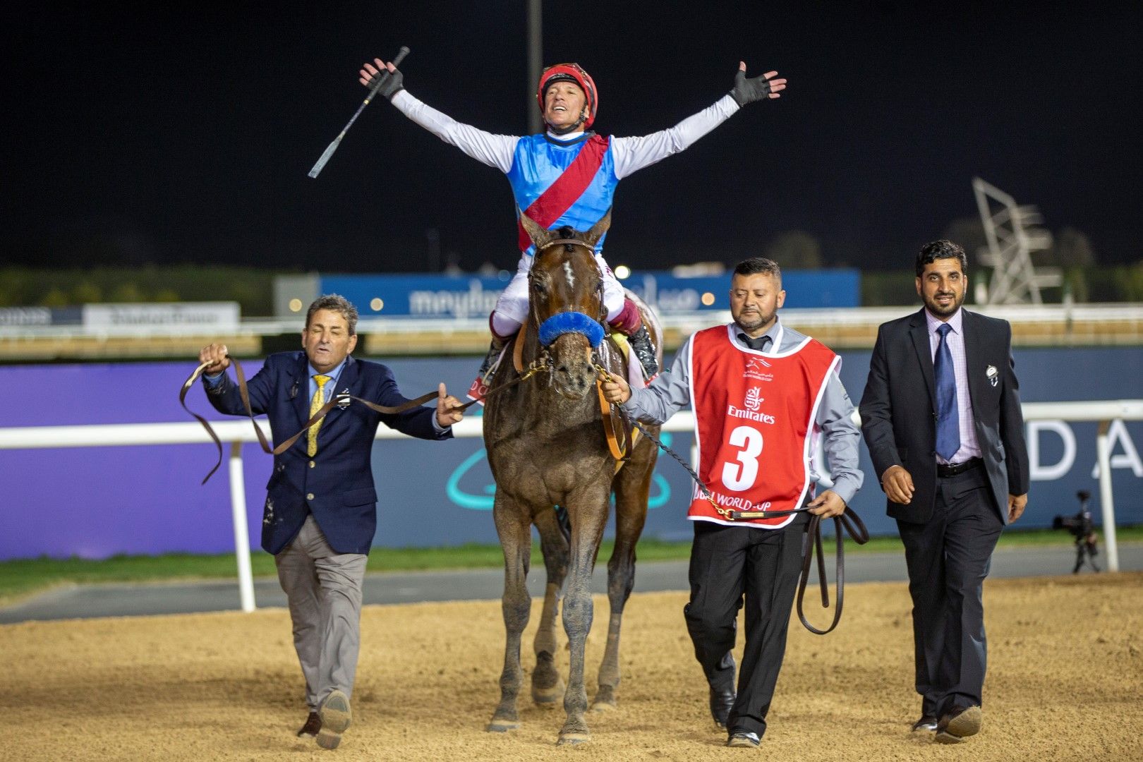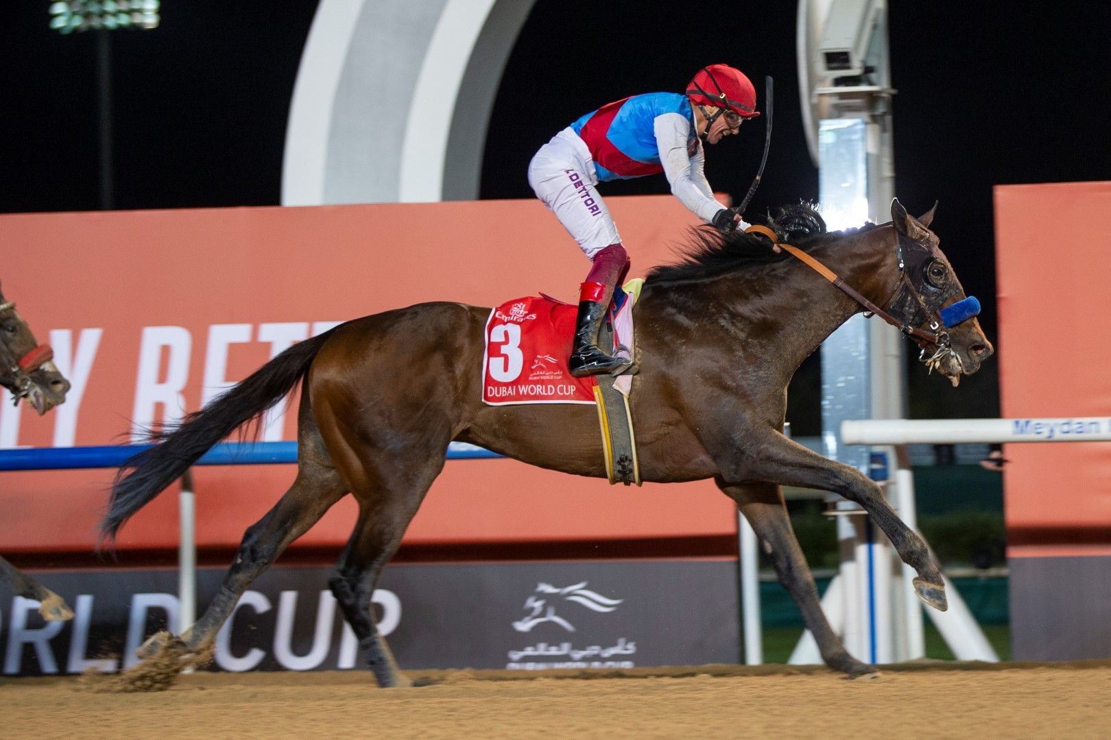 Dettori, who previously won the Dubai World Cup riding Dubai Millennium, Moon Ballad and Electrocutionist, won the race for the first time in colors other than those of Dubai-based racing operation Godolphin.