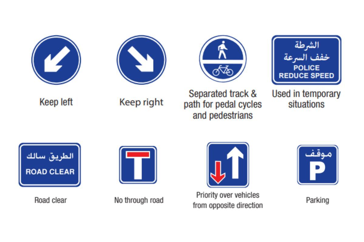 Blue: Blue signs are typically used to convey information or provide guidance. The symbols on these boards indicate change in directions, turns, cycle tracks, freeway control and minimum speed limit. Blue color on guide signs depicts national routes and also features the Emirates route symbol.