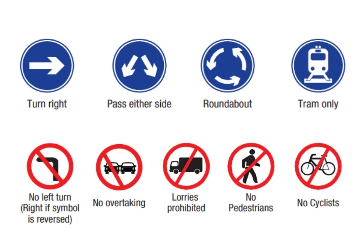 Circle: Circular signs indicate important instructions like speed limits. A red circle indicates prohibitory signs while a blue circle indicates mandatory signs. A red circle sign with a white horizontal bar indicates a prohibition, such as no entry or no U-turn while a blue circle with a white symbol represents a mandatory action, such as keeping left or following a specific lane.