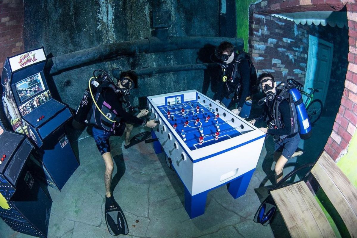 Deep Dive is a hygienic underwater marine life-free pool. The underwater city has multiple displays, such as art, arcades etc.