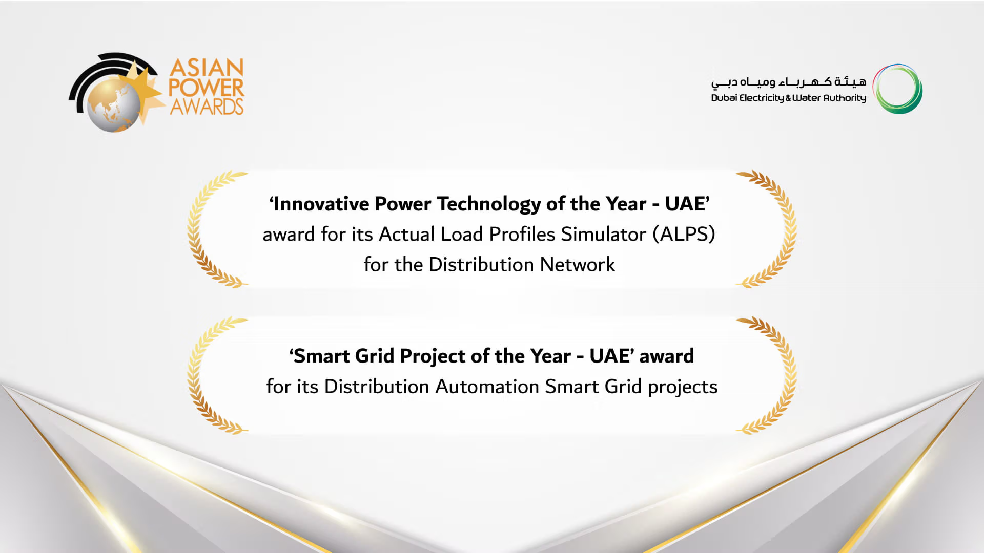 The awards, presented at a ceremony in Singapore's Conrad Centennial Hotel, honored DEWA with the ‘Innovative Power Technology of the Year - UAE’ for its Actual Load Profiles Simulator (ALPS) and the ‘Smart Grid Project of the Year - UAE’ for its Distribution Automation Smart Grid projects.