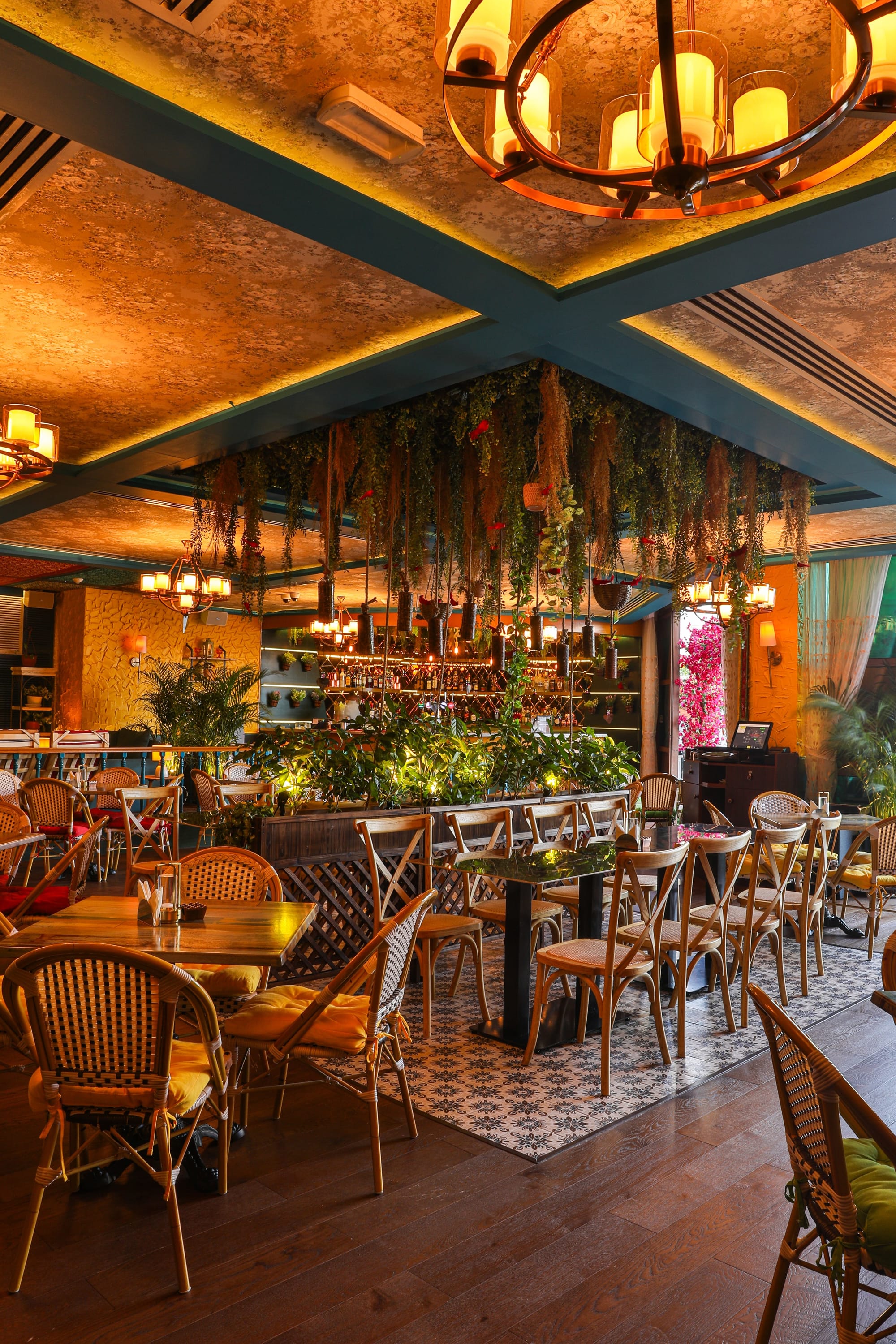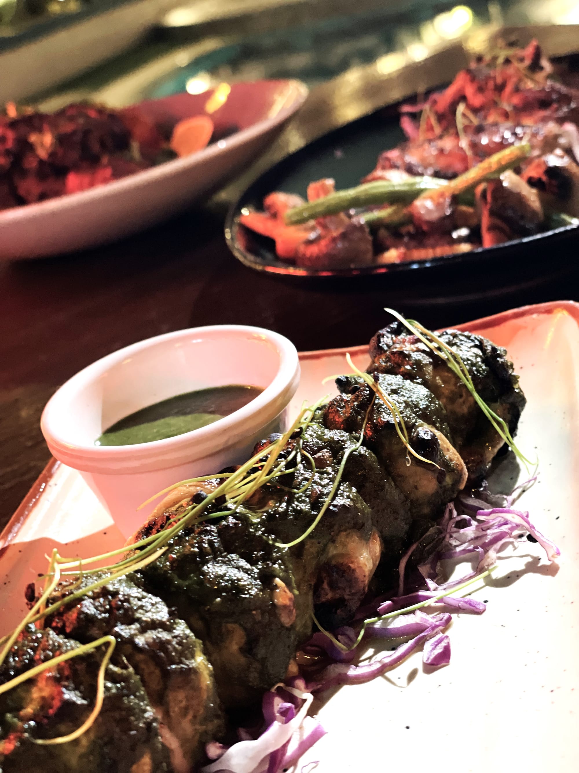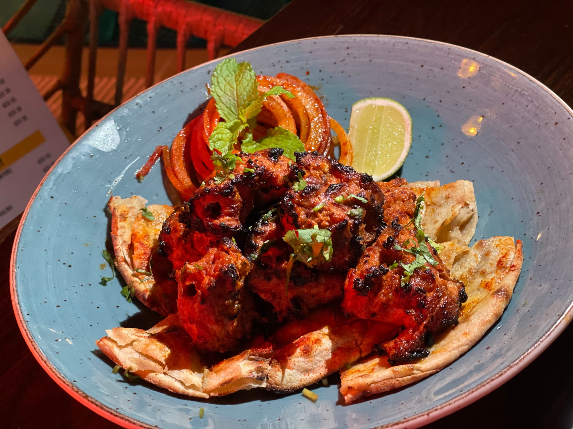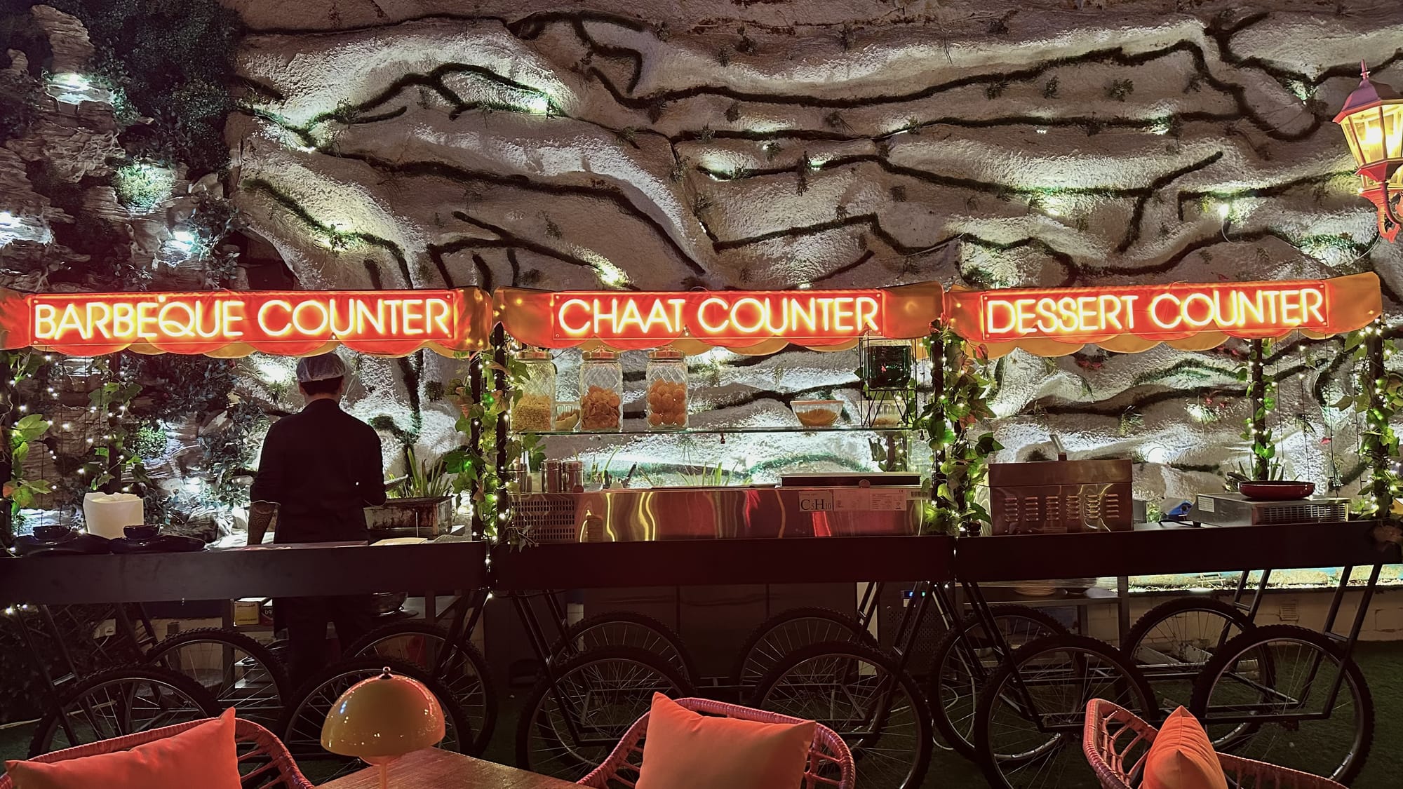 Pahadi Restaurant immerses guests in a cozy and whimsical ambiance, where mountain-inspired decor harmoniously blends with earthy elements. You will be greeted by a warm and rustic atmosphere that captures the essence of India's hill stations. The interior is a delightful fusion of modern and traditional aesthetics, featuring vibrant neon signs juxtaposed against natural textures and lush greenery.