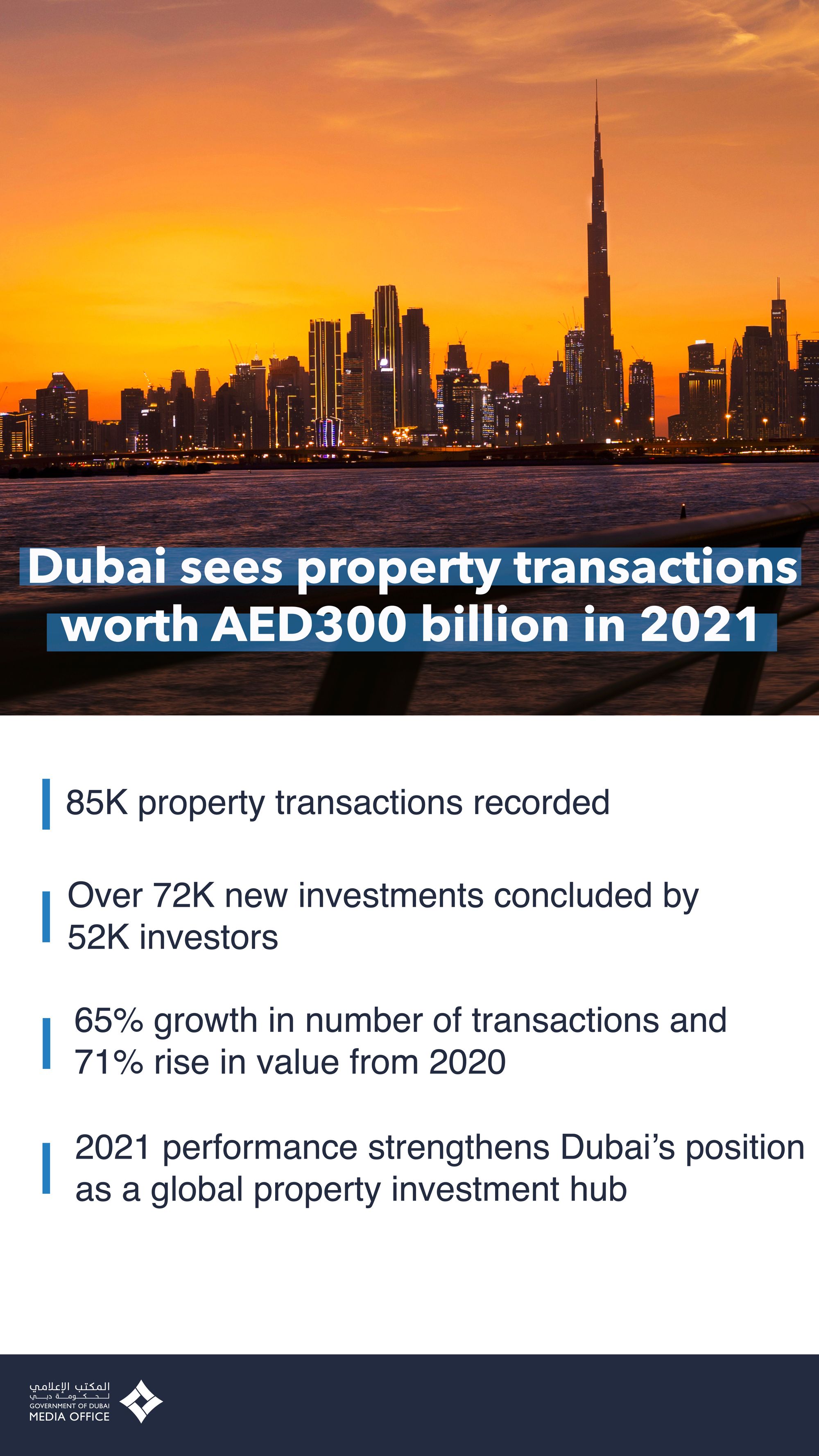 Dubai's real estate sector recorded 84,772 transactions representing a value of AED300 billion in 2021, according to the annual transaction report issued by the Dubai Land Department (DLD).