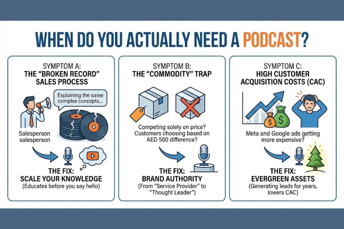 Are you being forced to compete solely on price? Are customers choosing your competitor just because they are AED 500 cheaper? The Fix: You have a brand authority problem. A podcast lifts you out of the commodity trap. It turns you from a "service provider" into a "thought leader." People pay a premium for authorities; they negotiate with commodities.