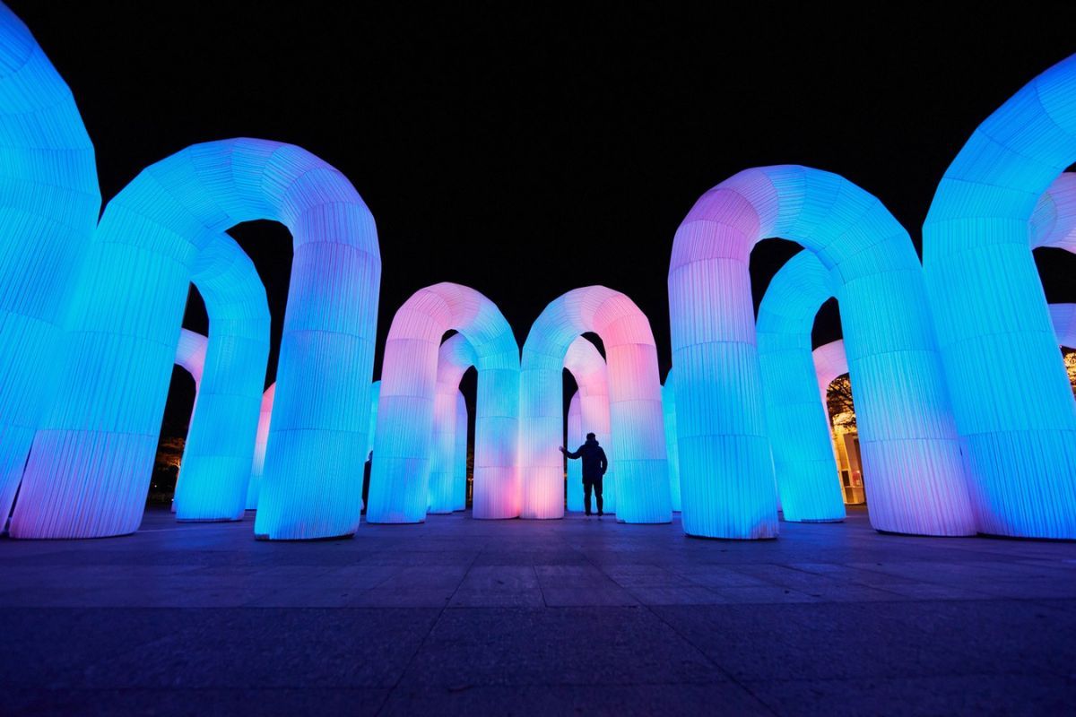 Sky Castle is an interactive light and sound art installation in Dubai Design District (d3). It brings beautiful color illumination to the space with the inflatable arches.
