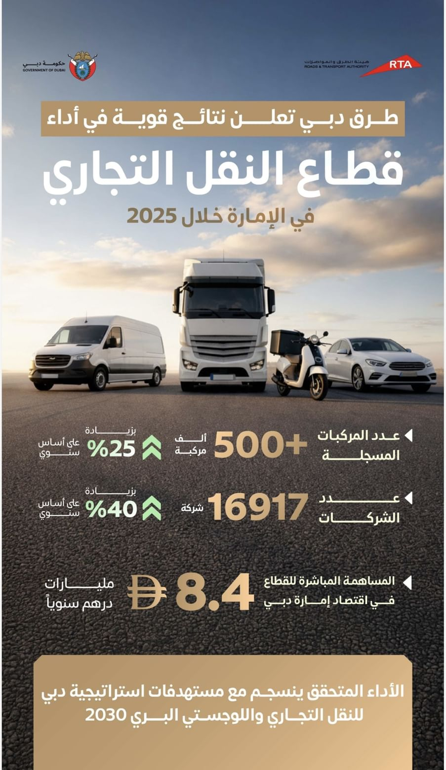 The commercial transport industry now contributes more than AED 8.4 billion annually to Dubai’s economy, reinforcing its role as a key driver of trade and logistics activity. Officials attributed the expansion to accelerated digital transformation, wider adoption of smart mobility solutions, and growing demand for app based delivery services alongside expanding logistics and vehicle rental operations.