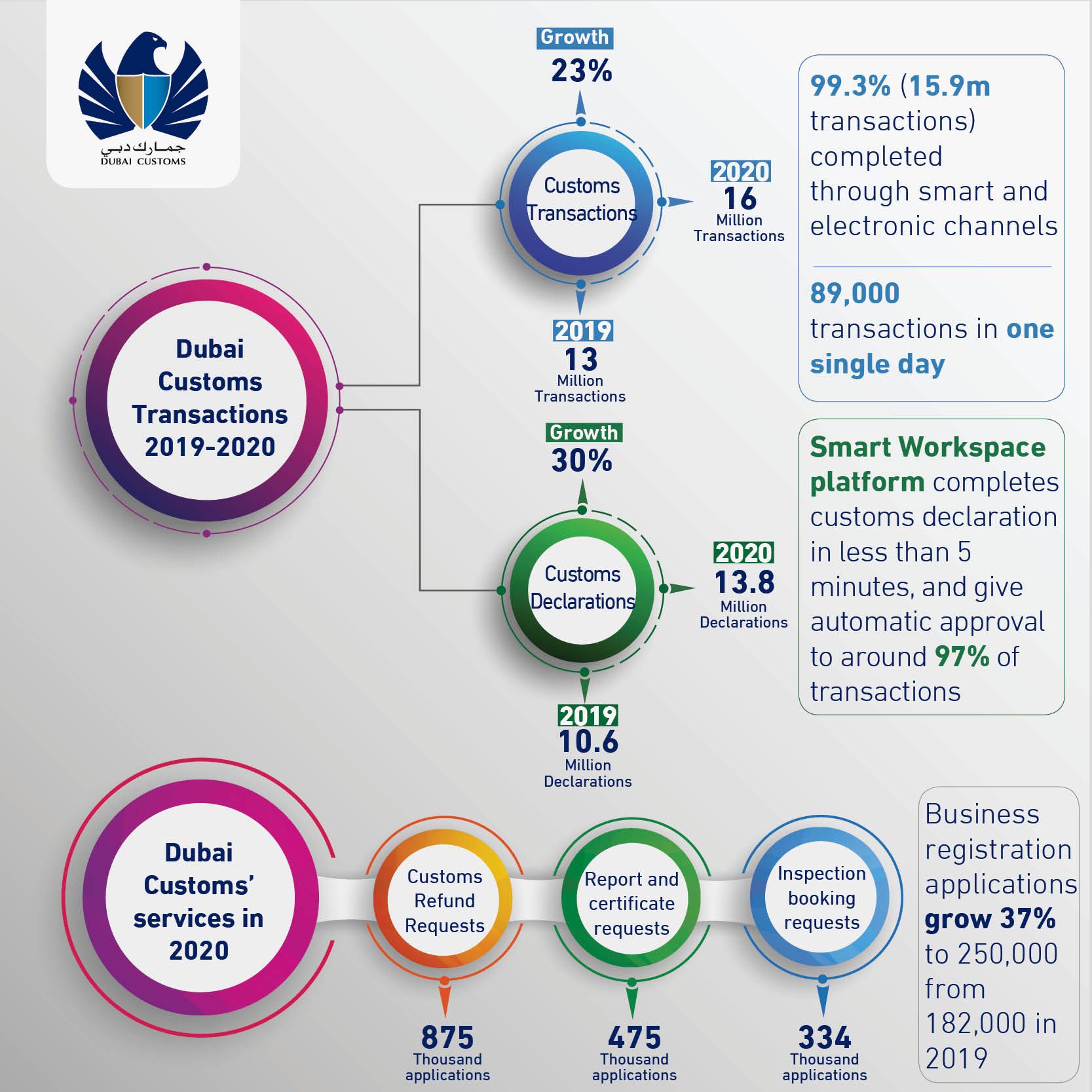 The growth in demand on Dubai Customs’ services during the pandemic reflects the exceptional efforts of the government department in serving the local and national community while also effectively securing our borders from any violation. The staggering growth of 23% in Dubai Customs’ transactions was made possible by its advanced systems and reflects the organisation’s quick response to challenges posed by the pandemic.”