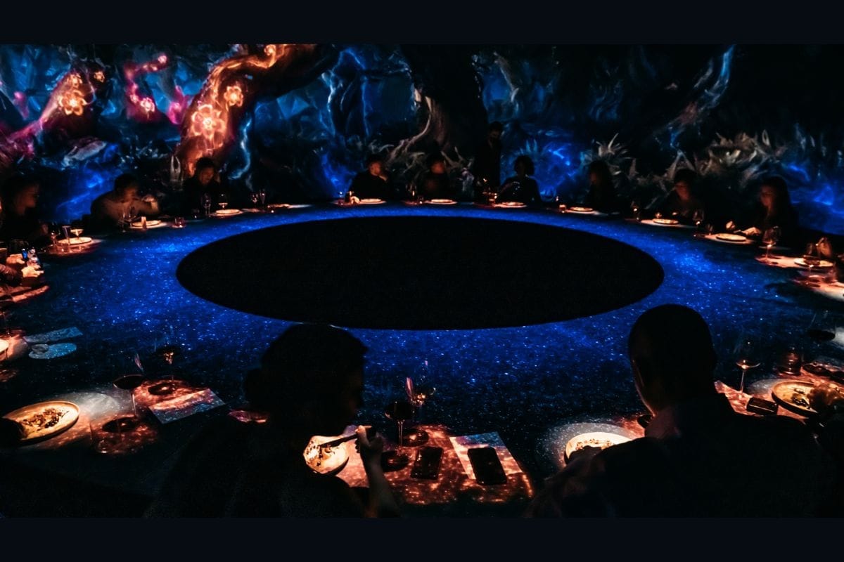 Located at The Address Downtown Hotel, KRASOTA's Imaginary Art Show is set in an auditorium with curved walls, featuring a large circular table for 20 diners. The 3D multimedia performance includes projections of paintings by contemporary artists, with each course on the menu dedicated to an artwork.