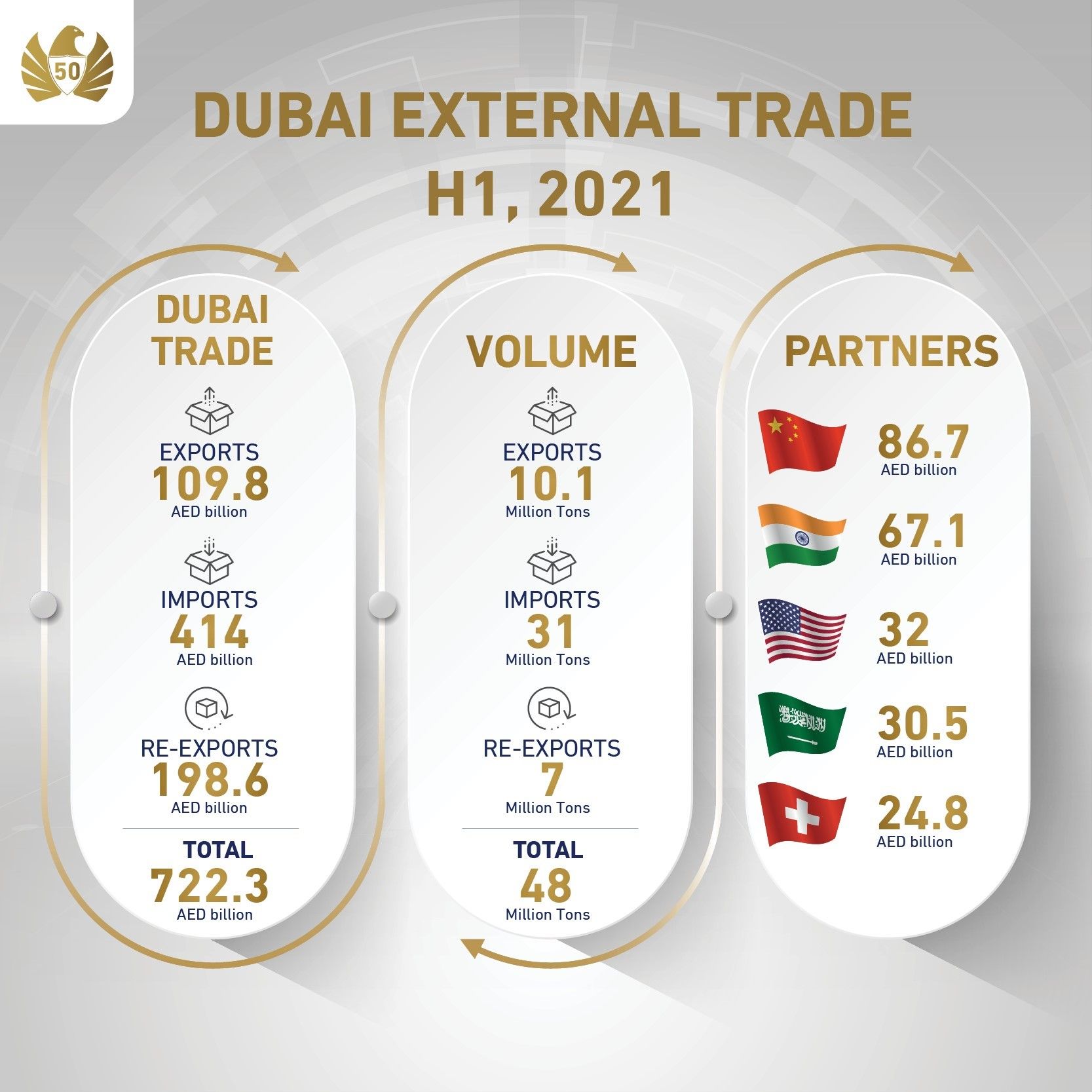 Exports grew 45 percent year on year (YoY) in H1 2021 to AED109.8 billion from AED75.8 billion, which supports the goal of the 10 x 10 programme (one of the nation’s ‘Projects of the 50’ initiatives) to increase the UAE’s exports to 10 global markets by 10 percent annually. Imports rose by 29.3 percent YoY to AED414 billion from AED320 billion. Re-exports grew 28.3 percent YoY to AED198.6 from AED154.79.