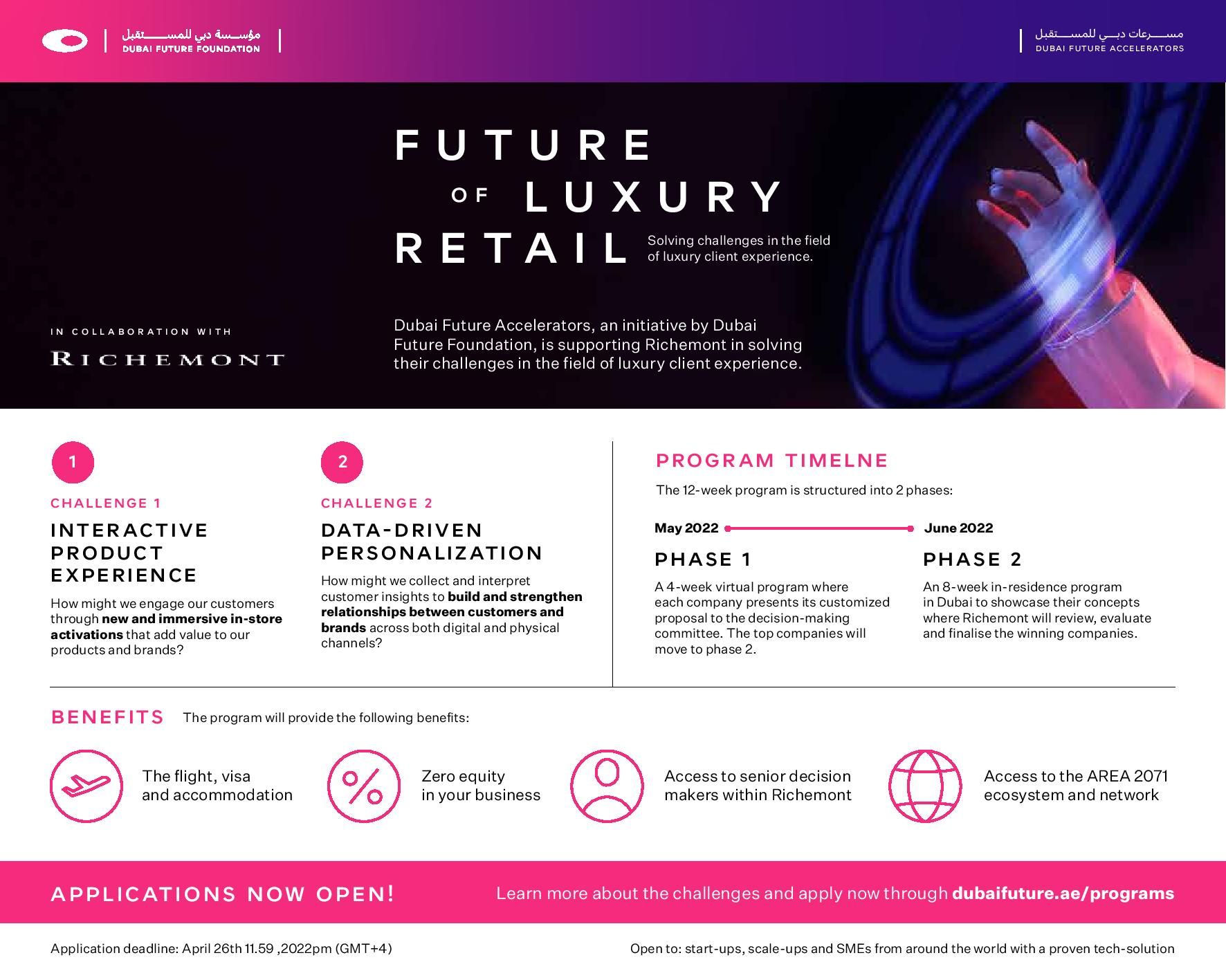"The Future of Luxury Retail challenge is part of Dubai Future Foundation’s efforts to strengthen partnerships with the private sector at the local, regional and global levels and to provide an opportunity for entrepreneurs and innovators to launch new tech-enabled solutions from Dubai."