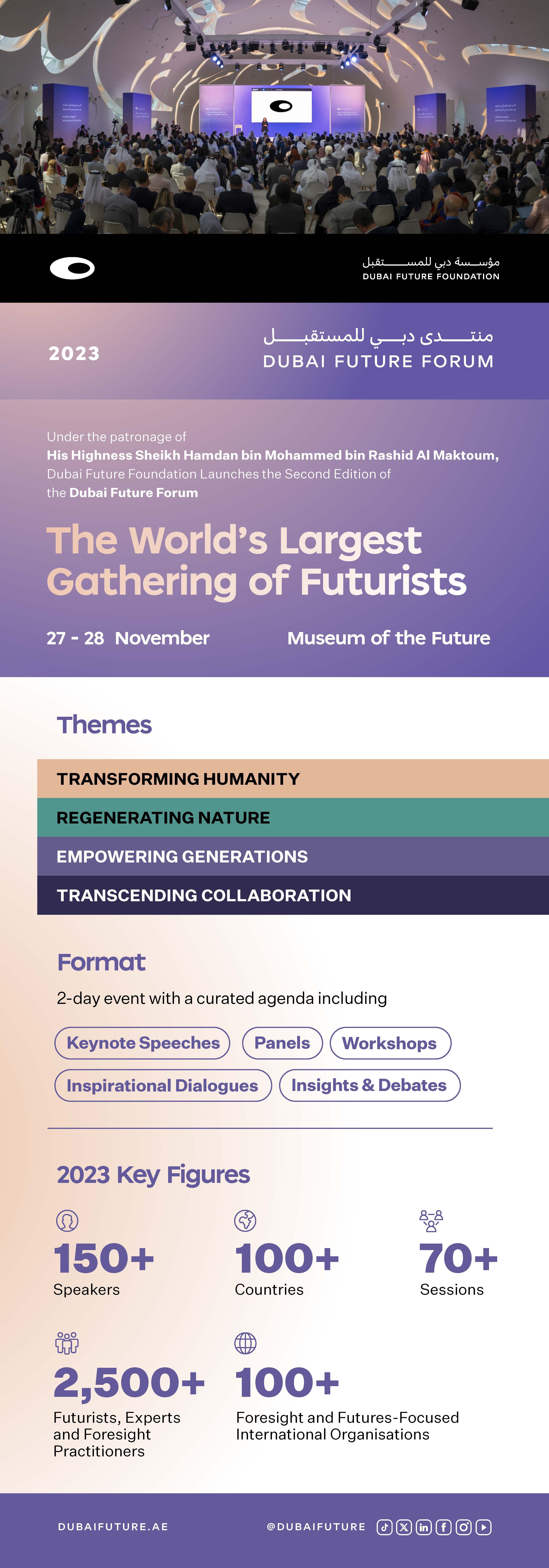 DFF’s flagship event offers an international platform for sharing insights, experiences, inspirations and foresight that will shape the future of humanity in vital and futuristic sectors. Dubai Future Forum 2023 will bring together over 2,500 futurists, leaders and experts from more than 100 countries, as well as representatives from more than 100 top global institutions specialising in foresight and future sectors. Additionally, it will feature approximately 150 speakers participating in more than 70 inspiring sessions dedicated to discussing, debating and predicting the future trajectory of the world.