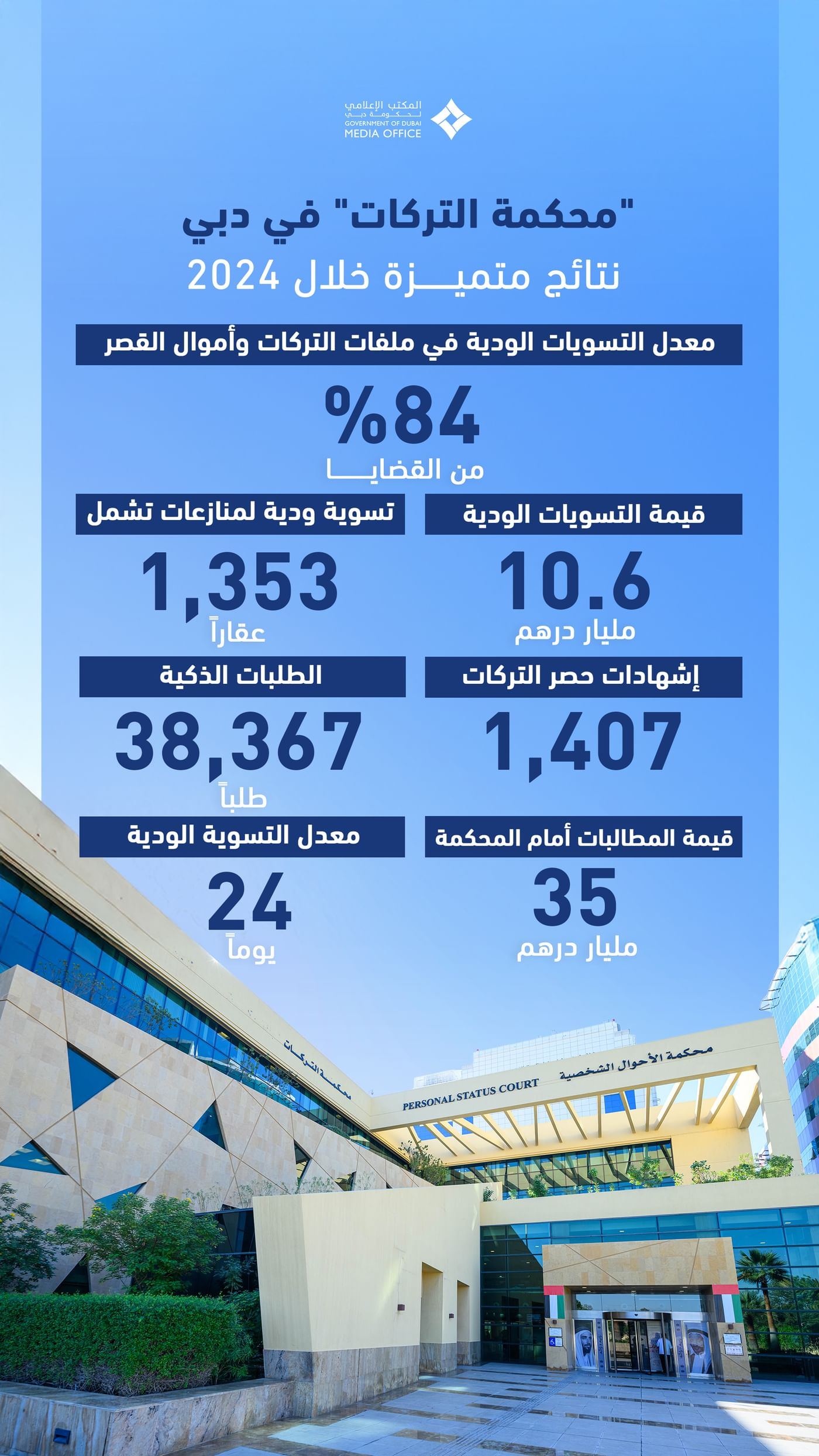 Demonstrating operational efficiency, the court processed 38,367 smart applications. The total value of assets managed, including guardianship holdings, exceeded AED583 million, while amicable settlements in inheritance and guardianship disputes surpassed AED10 billion. The overall value of claims brought before the court exceeded AED35 billion, with cases resolved in an average of just 24 days.
