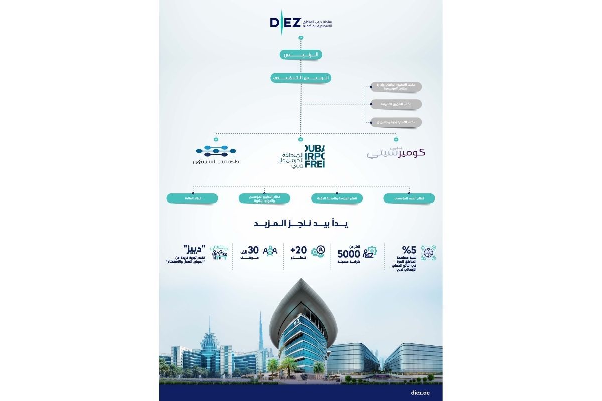 DIEZ’s organisational structure conforms to Law No. 16 of 2021 issued by His Highness Sheikh Mohammed bin Rashid Al Maktoum, Vice President, Prime Minister and Ruler of Dubai. The Law aims to strengthen Dubai's economy by integrating three different free zones, which will enable the emirate to provide an exceptional investment and business experience and high-quality solutions and services to businesses.