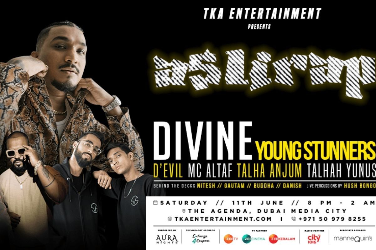 Headlined by the famous Indian rapper, DIVINE, Aslirap is an event focused on inspiring young desi talents and giving them an experience of a live musical concert by their favorite Role Models. Supporting the night and transforming the venue into larger-than-life club are local DJs from the Middle east setting transition smoothly between RnB, Hip-hop & Bollywood. Aslirap is not just another live music concert it is an experience of club nights with live performances on a larger platform.