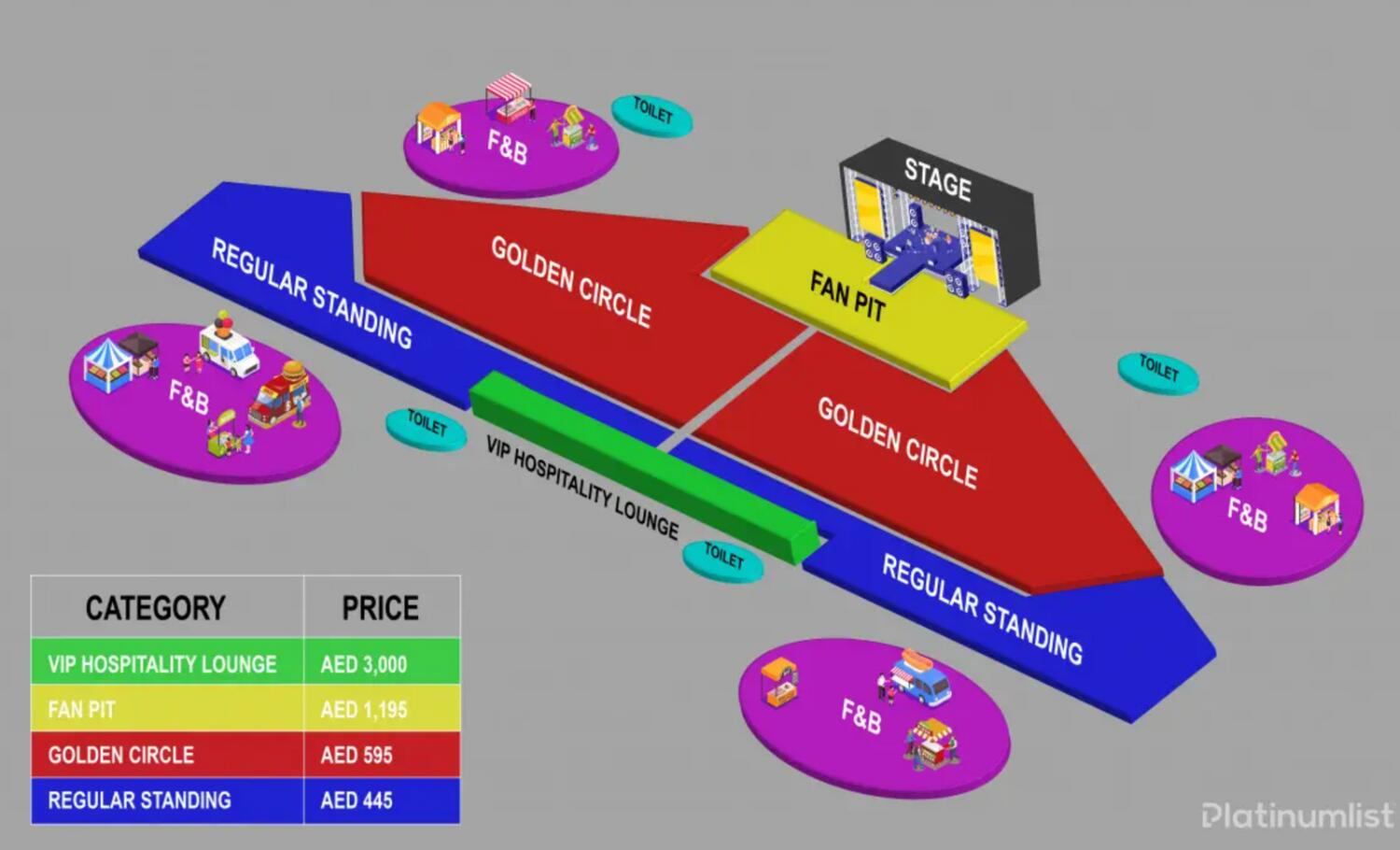 Tickets for the concert are still available on Platinumlist, with prices starting at Dh445 for Rear Standing. Other options include: