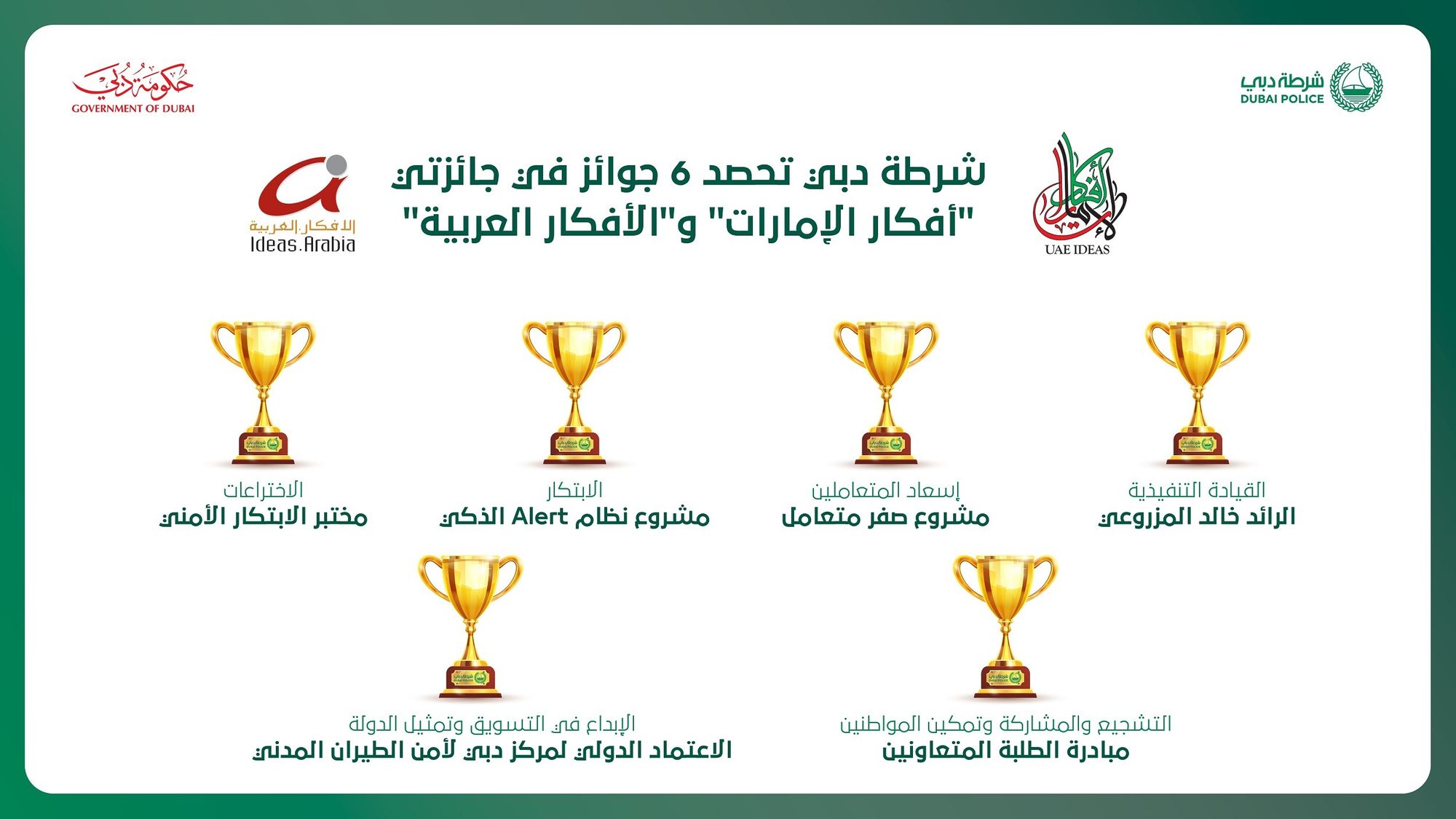 The Dubai Police has recently bagged six awards at the 9th UAE Ideas Awards 2020 and the 5th Ideas Arabia International Award for five innovative projects and initiatives during 2020.