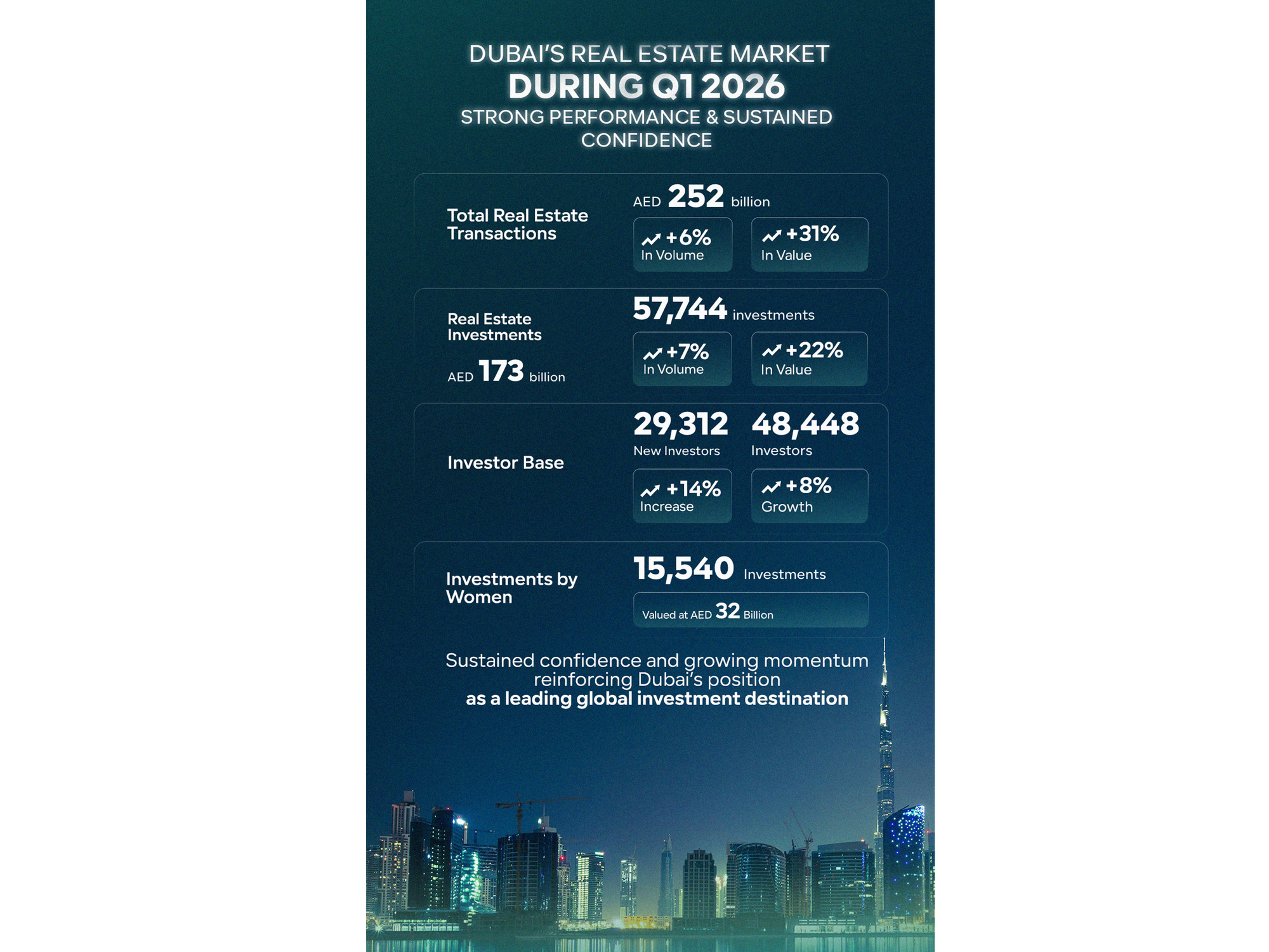 Dubai’s real estate sector posted a robust start to 2026, recording AED252 billion in transactions during the first quarter, a 31 percent year-on-year increase in value and a 6 percent rise in volume, underscoring strong investor confidence and sustained market momentum.