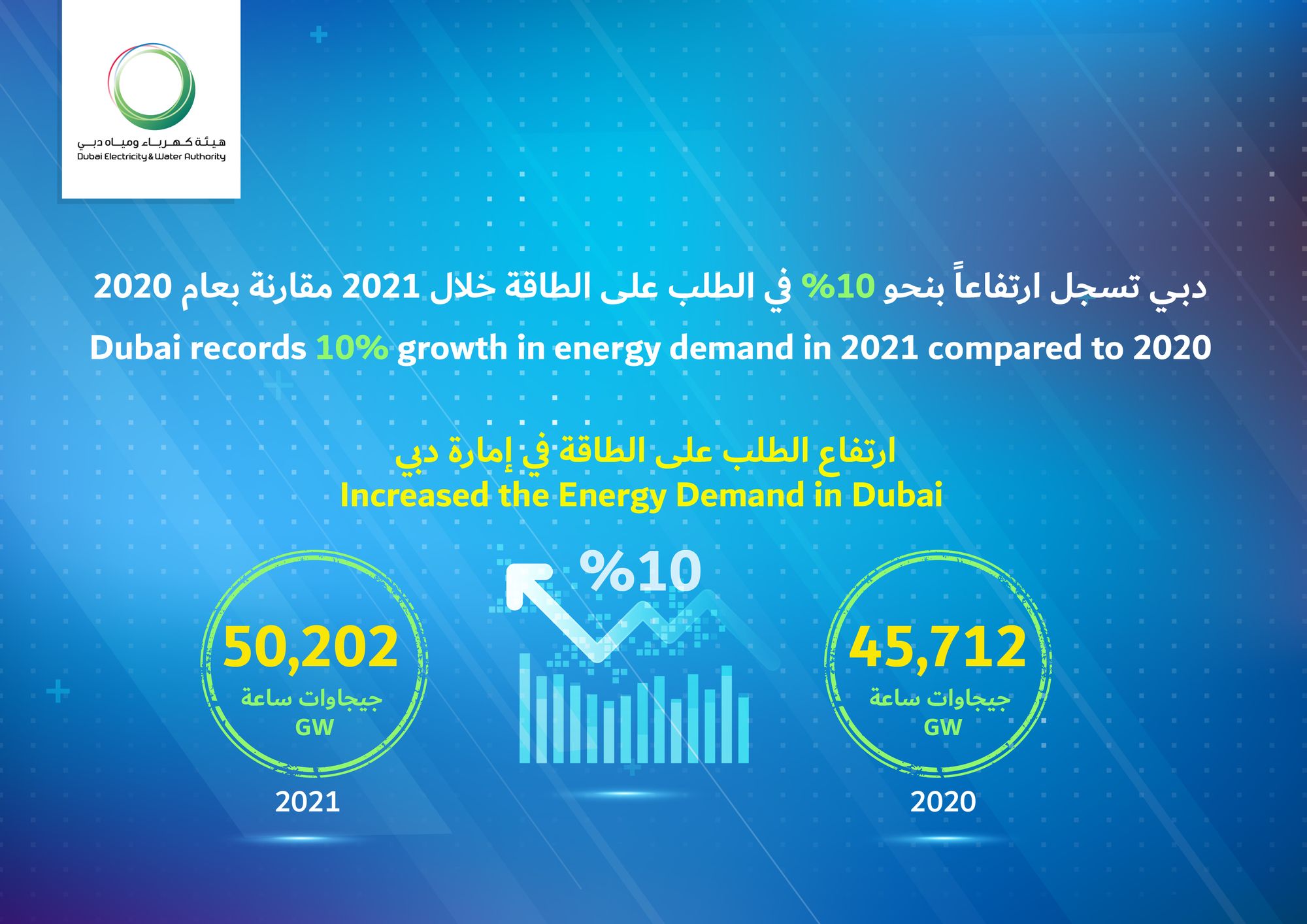 HE Saeed Mohammed Al Tayer, MD & CEO of Dubai Electricity and Water Authority (DEWA), announced that energy demand in Dubai increased in 2021 by around 10% compared to 2020. Energy demand in 2021 reached 50,202 gigawatt-hours compared to 45,712 gigawatt-hours in 2020.