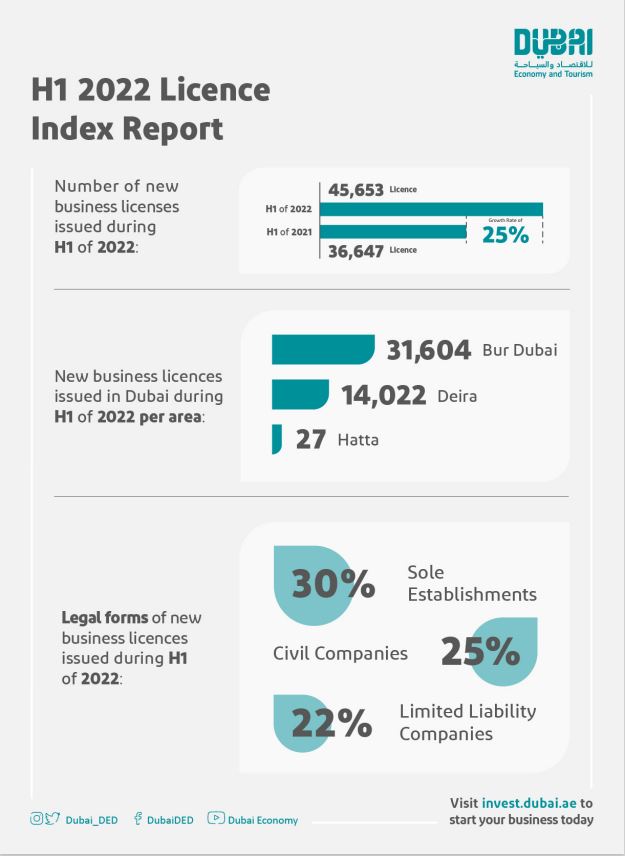 Dubai issued 45,653 new business licences in the first half (H1) of 2022, a growth of 25% compared to H1 2021 when 36,647 licenses were issued