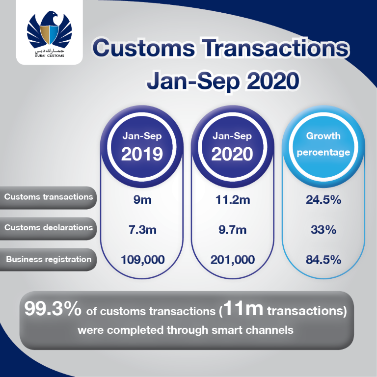 Dubai Customs also completed 648,000 refund claims, 357,600 certificate and report requests, and 257,000 inspection-booking requests as of the end of September 2020.