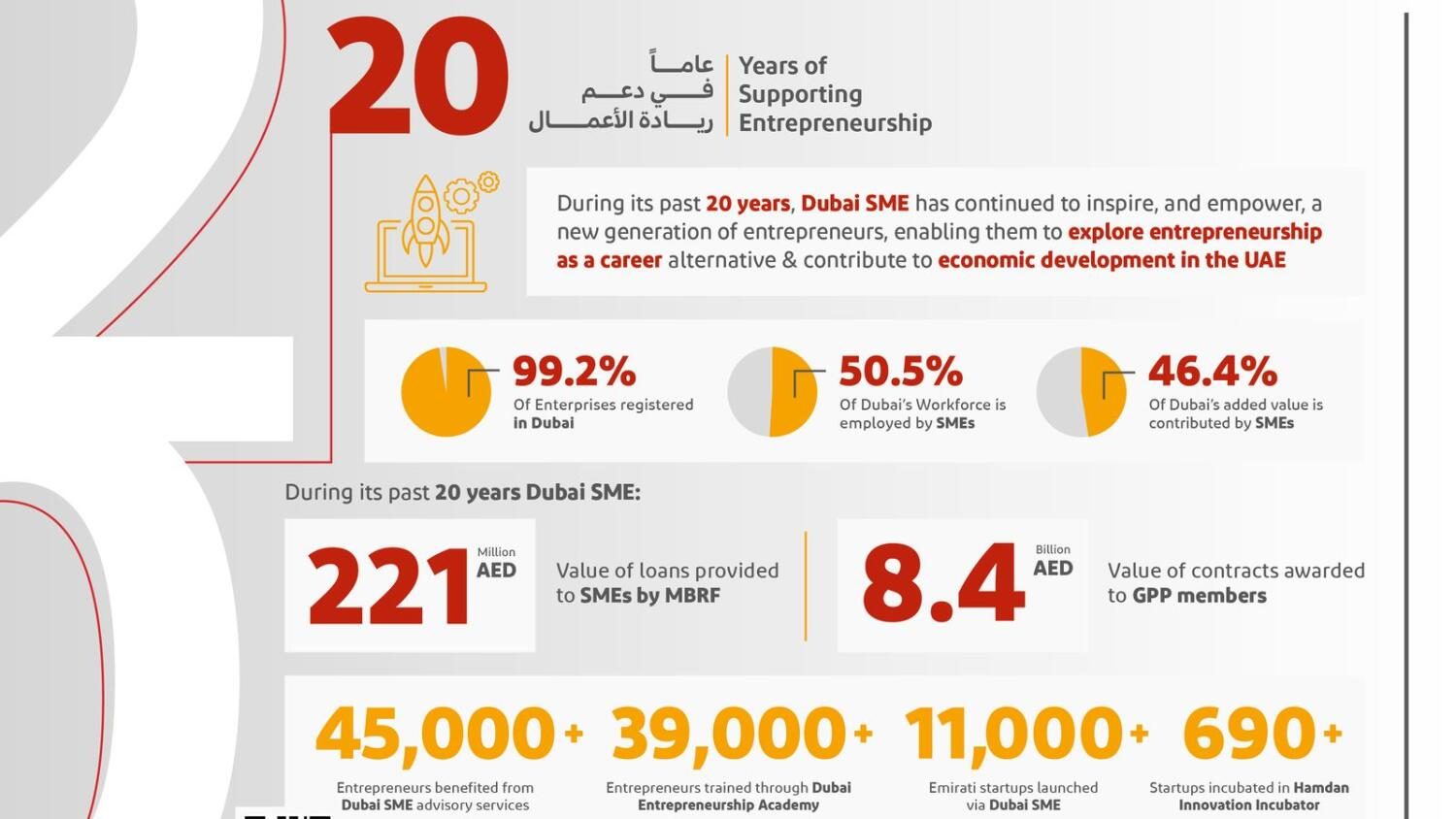 More than 45,000 entrepreneurs have benefitted from the advisory services of Dubai SME during the last 20 years while the Dubai Entrepreneurship Academy, the educational arm of Dubai SME, has trained 39,000 people in diverse disciplines of start-up development, thus preparing them for future success in the knowledge-driven economy in the UAE.