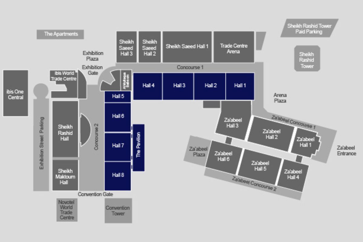 The Dubai World Trade Centre is located on Sheikh Zayed Road and can be accessed by public transport and provides parking space for vehicles.
