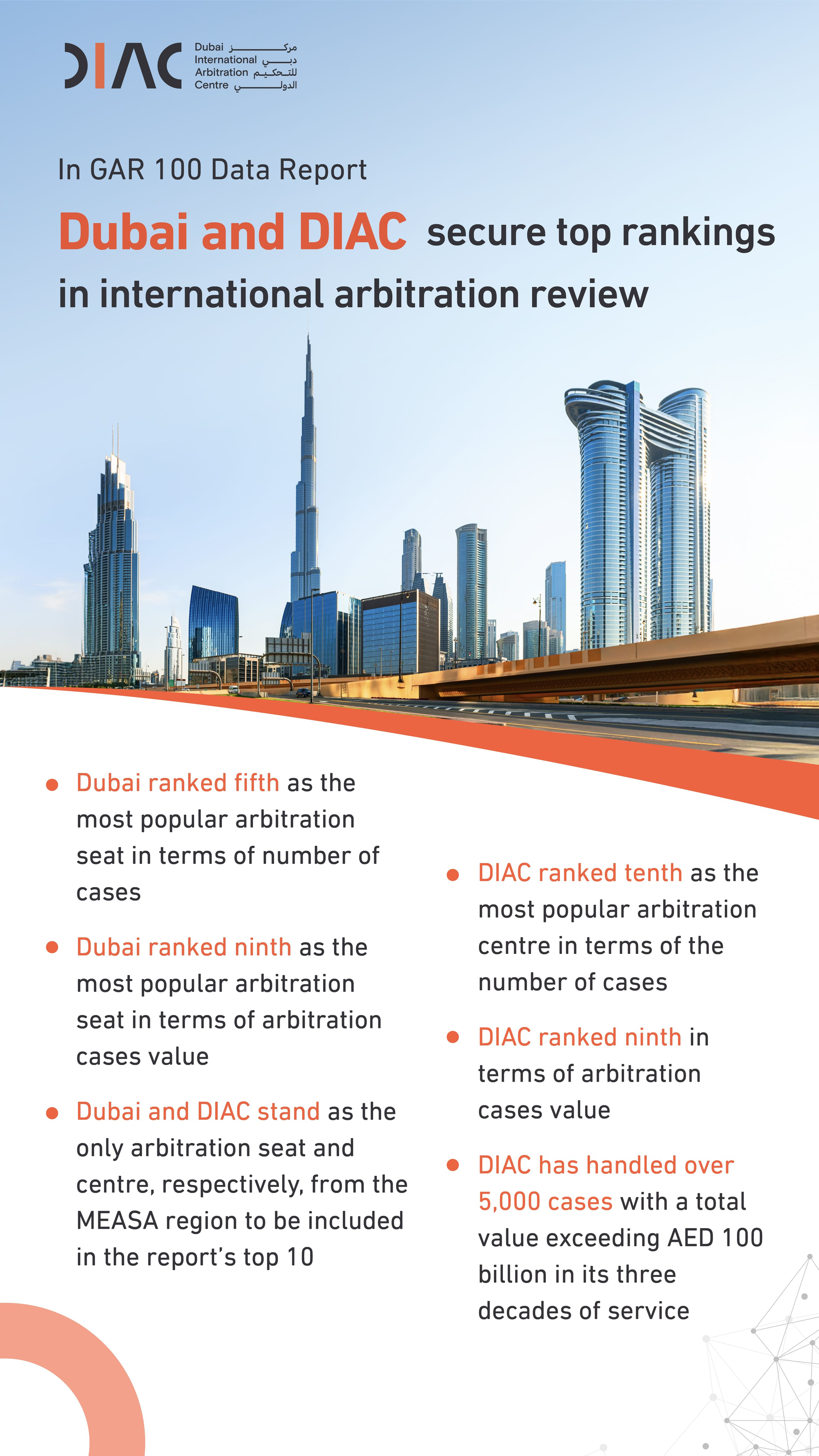 The Dubai International Arbitration Centre (DIAC) has achieved high rankings in the GAR 100 Data Report, published by Global Arbitration Review (GAR)—the leading global authority on arbitration.